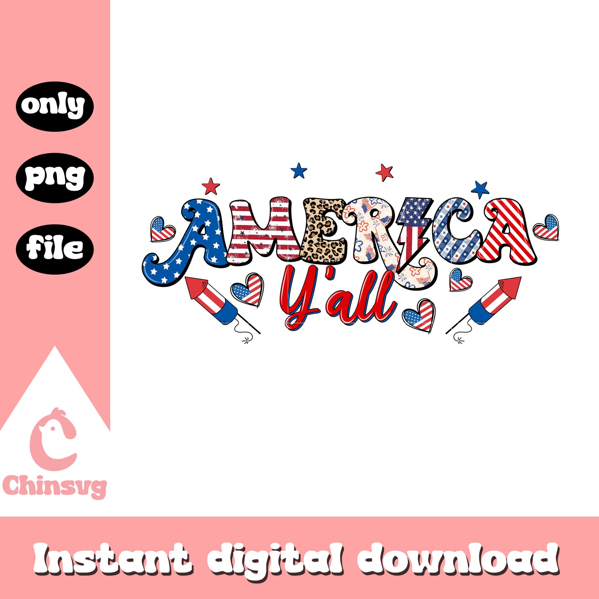America y'all png is a product of our 4th of July collection. Get ready to celebrate America’s Independence Day in style with our 4th of July SVG Collection! Packed with bold red, white, and blue designs, this collection features patriotic graphics, fun quotes, fireworks, flags, and more. Perfect for DIY apparel, party decorations, and personalized gifts that light up the holiday spirit!