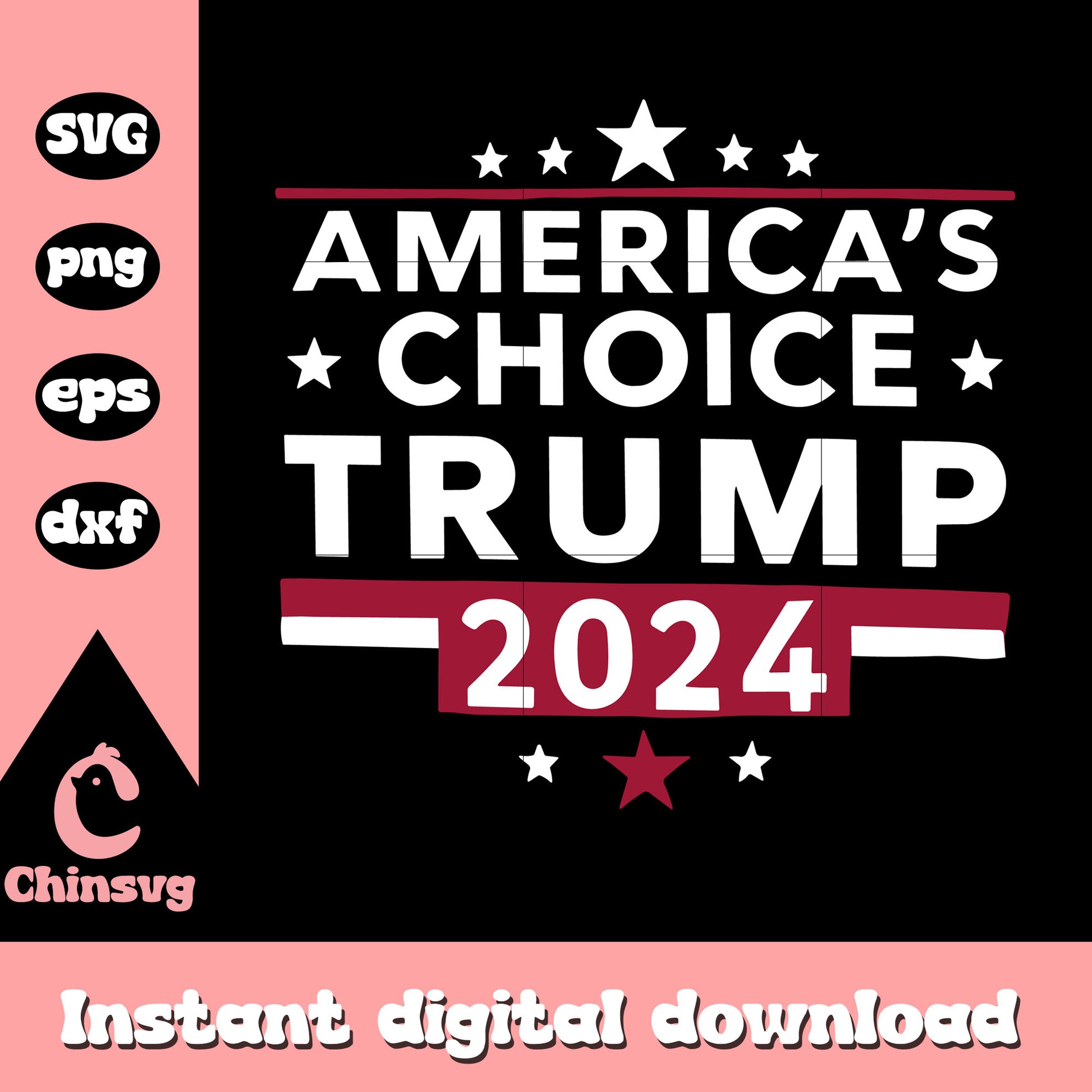 America's choice trump 2024 logo svg is a product of our Trump collection. Designed for those who want to make a bold impact. Perfect for a range of projects, this collection includes iconic portraits, patriotic symbols, and popular slogans associated with the Trump era. Whether you're creating custom apparel, banners, stickers, or social media content, these high-quality designs offer a unique way to express your perspective.