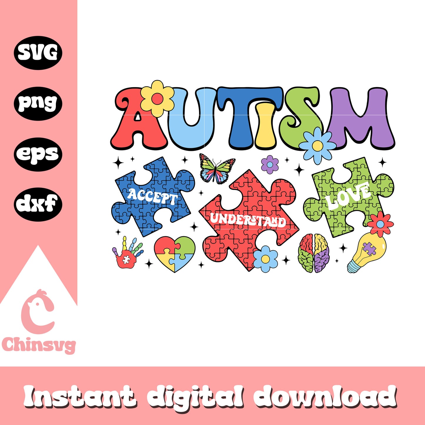 - A variety of Autism-themed elements: puzzle pieces, hearts, infinity symbols, handprints, and supportive phrases.