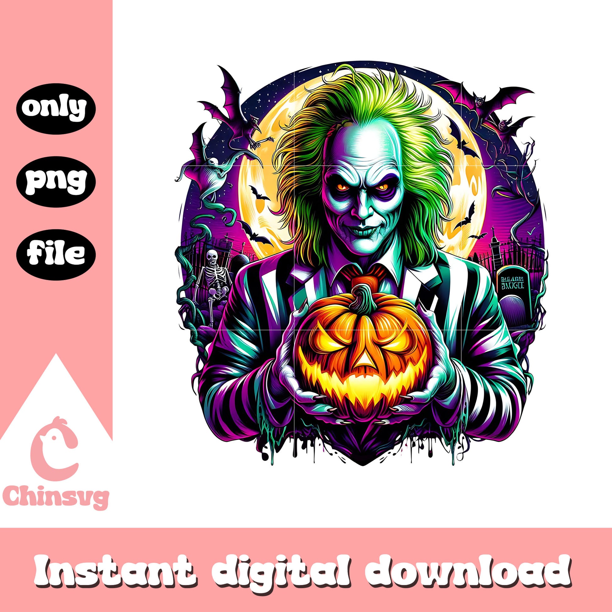 Beetlejuice holding pumpkin halloween png is a product of our Halloween collection. Whether you're crafting spooky decorations, designing party invitations, or creating unique apparel, this collection is packed with high-quality, detailed graphics that perfectly capture the spirit of Halloween. From pumpkins, ghosts, bats, to witches, skeletons, and more, this set offers endless possibilities for your creative ideas.