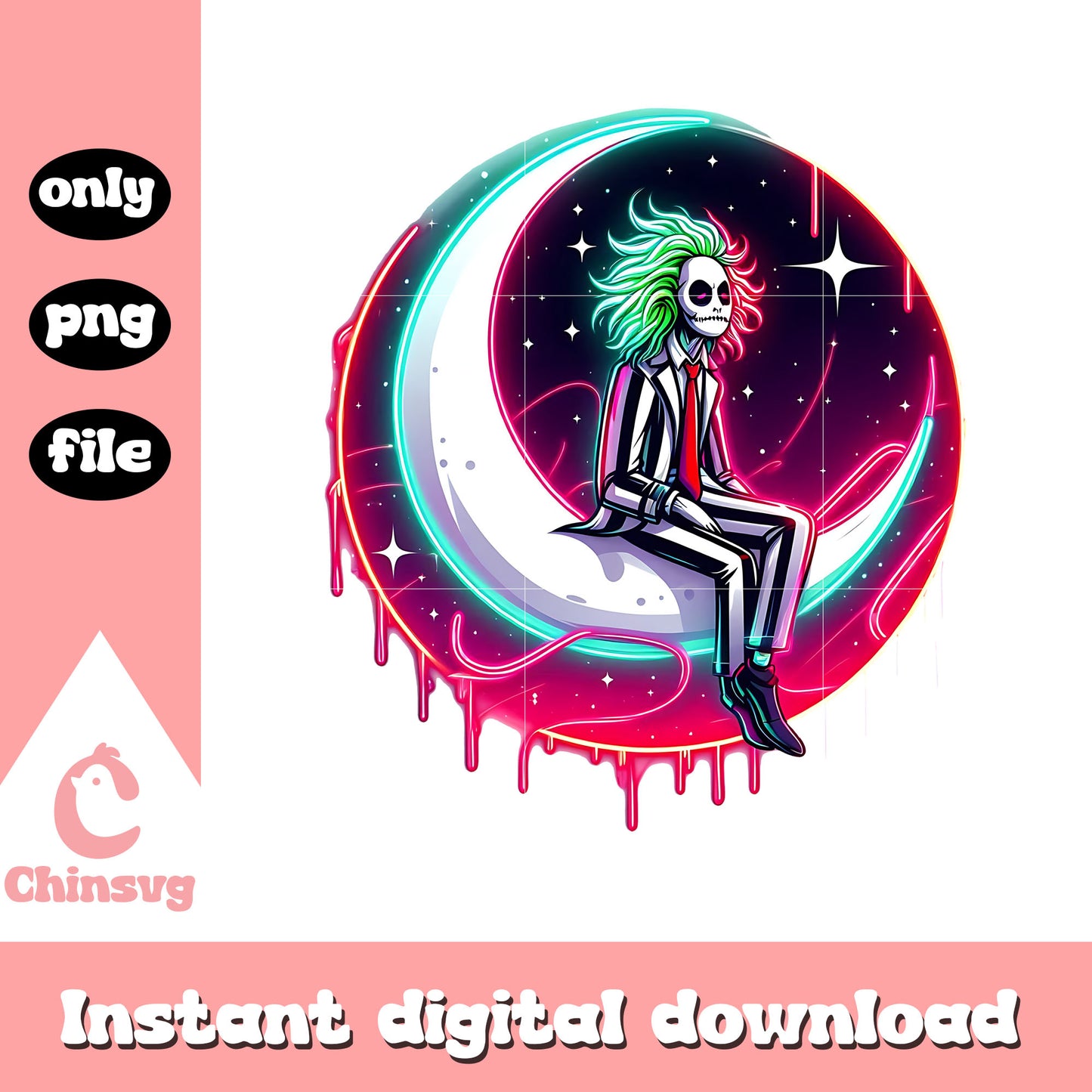 Beetlejuice moon neon halloween design png is a product of our Halloween collection. Whether you're crafting spooky decorations, designing party invitations, or creating unique apparel, this collection is packed with high-quality, detailed graphics that perfectly capture the spirit of Halloween. From pumpkins, ghosts, bats, to witches, skeletons, and more, this set offers endless possibilities for your creative ideas.