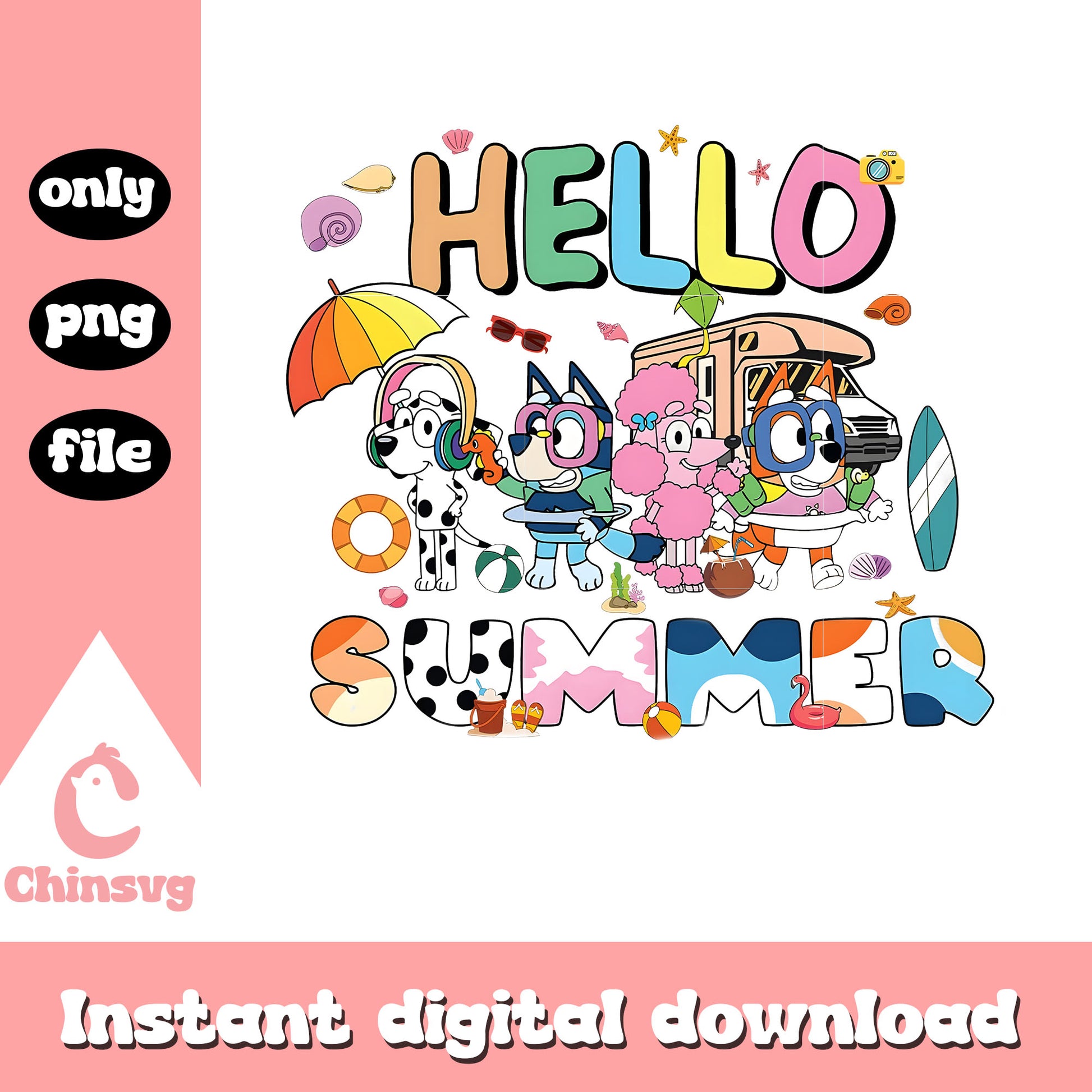 Bluey and friends hello summer design png is a product of our Bluey collection. Packed with vibrant, fun, and creative illustrations, this collection features a wide range of adorable characters, colorful icons, and lively scenes that will brighten up any project. Whether you’re designing for kids' parties, custom apparel, or digital art, these high-quality files are perfect for unleashing your creativity.