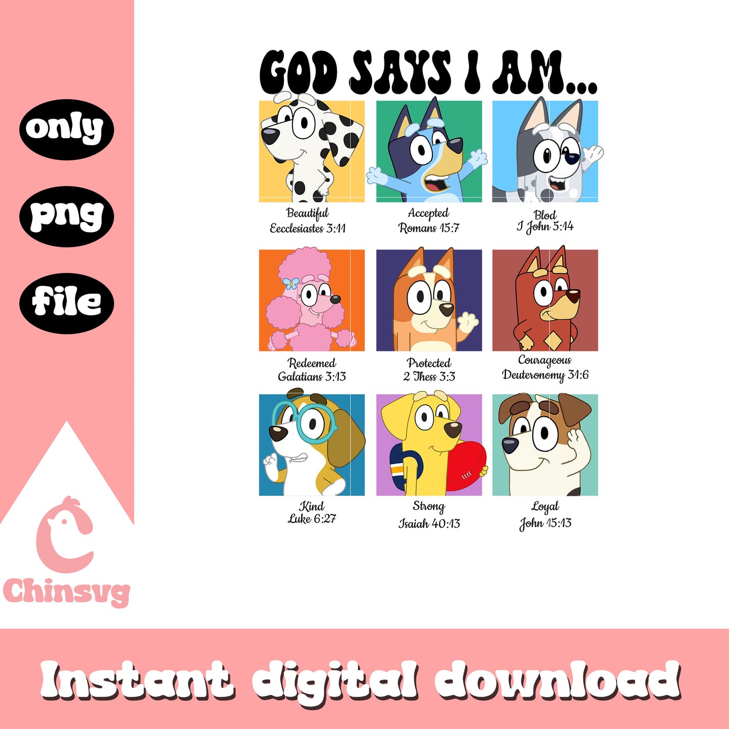 Bluey characters god says I am png is a product of our Bluey collection. Packed with vibrant, fun, and creative illustrations, this collection features a wide range of adorable characters, colorful icons, and lively scenes that will brighten up any project. Whether you’re designing for kids' parties, custom apparel, or digital art, these high-quality files are perfect for unleashing your creativity.