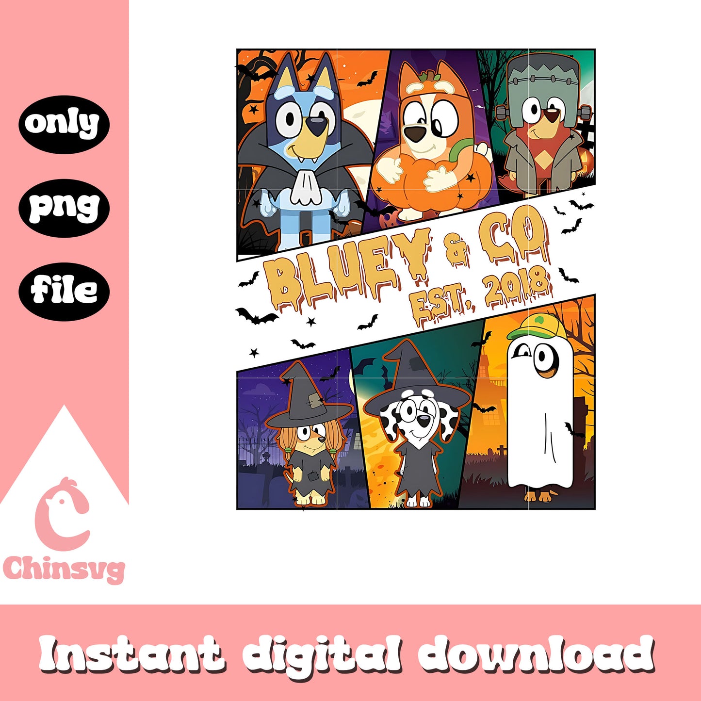 Bluey & co est 2018 halloween png, halloween png, bluey cast png