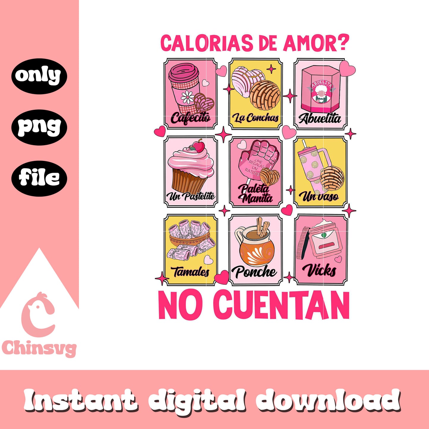 Calories de amor no cuentan valentine png is a product of our Valentine collection. Whether you’re crafting personalized gifts, romantic cards, or decorating for a special day, this collection is filled with beautiful designs that capture the spirit of Valentine’s Day. Featuring hearts, roses, Cupid, love quotes, and more, these high-quality files will inspire your creativity and help you make something truly unforgettable for your loved ones.