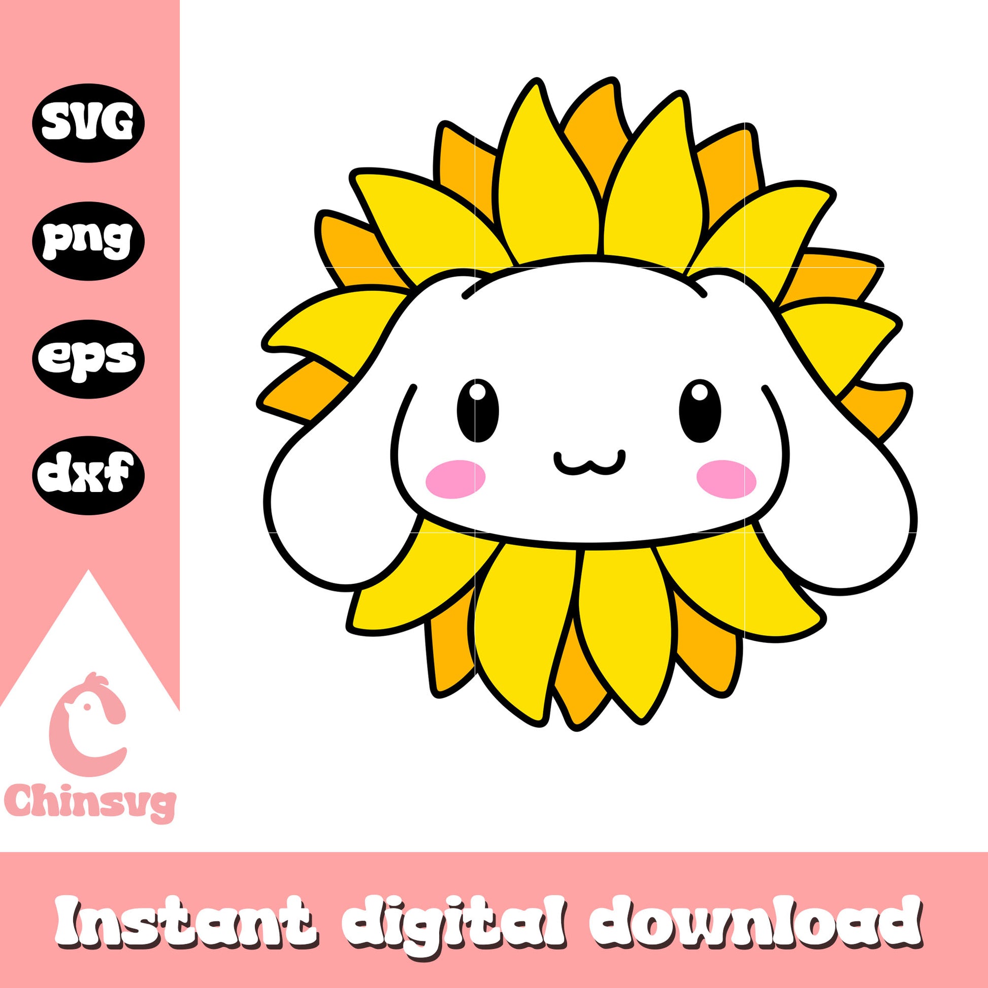 Cinnamoroll face sunflower design svg is a product of our hello kitty collection. Featuring the beloved character and her charming world, this collection is perfect for fans, crafters, and designers of all ages. Whether you're creating party decorations, custom gifts, or digital artwork, these high-quality designs will make every project extra cute and memorable.