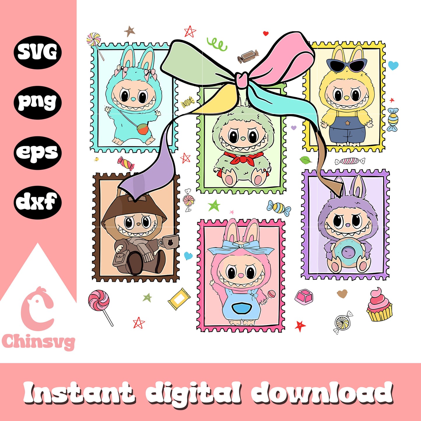 Coquette ribbon labubu doll frame svg, labubu outfits svg