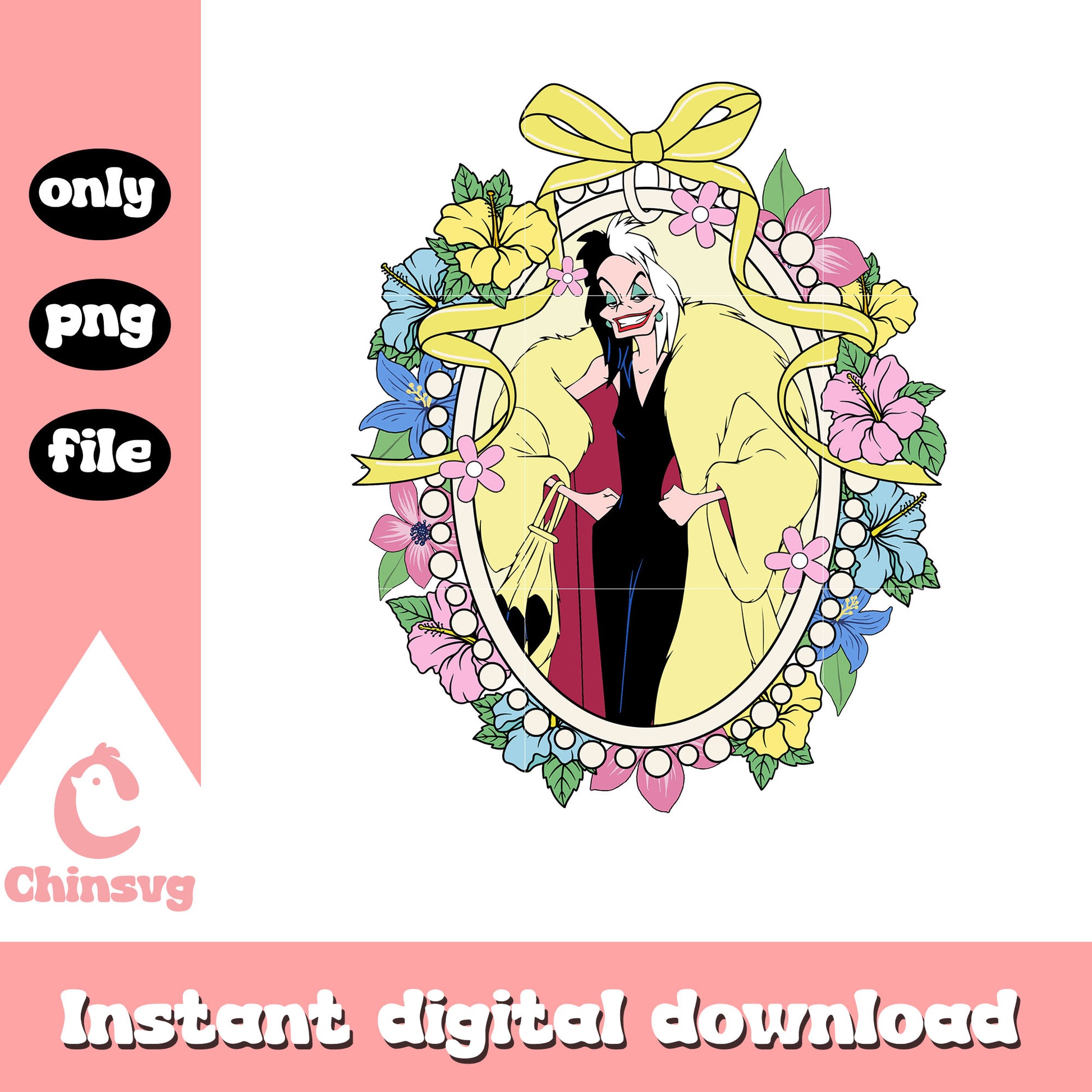 Cruella de Vil mirror png is a product of our Disney collection. Perfect for Disney fans of all ages, this collection captures the charm and nostalgia of your favorite characters and magical worlds. Featuring a range of beloved characters, castles, magical icons, and whimsical designs, these files are ideal for creating everything from custom apparel to party decorations and personalized gifts.