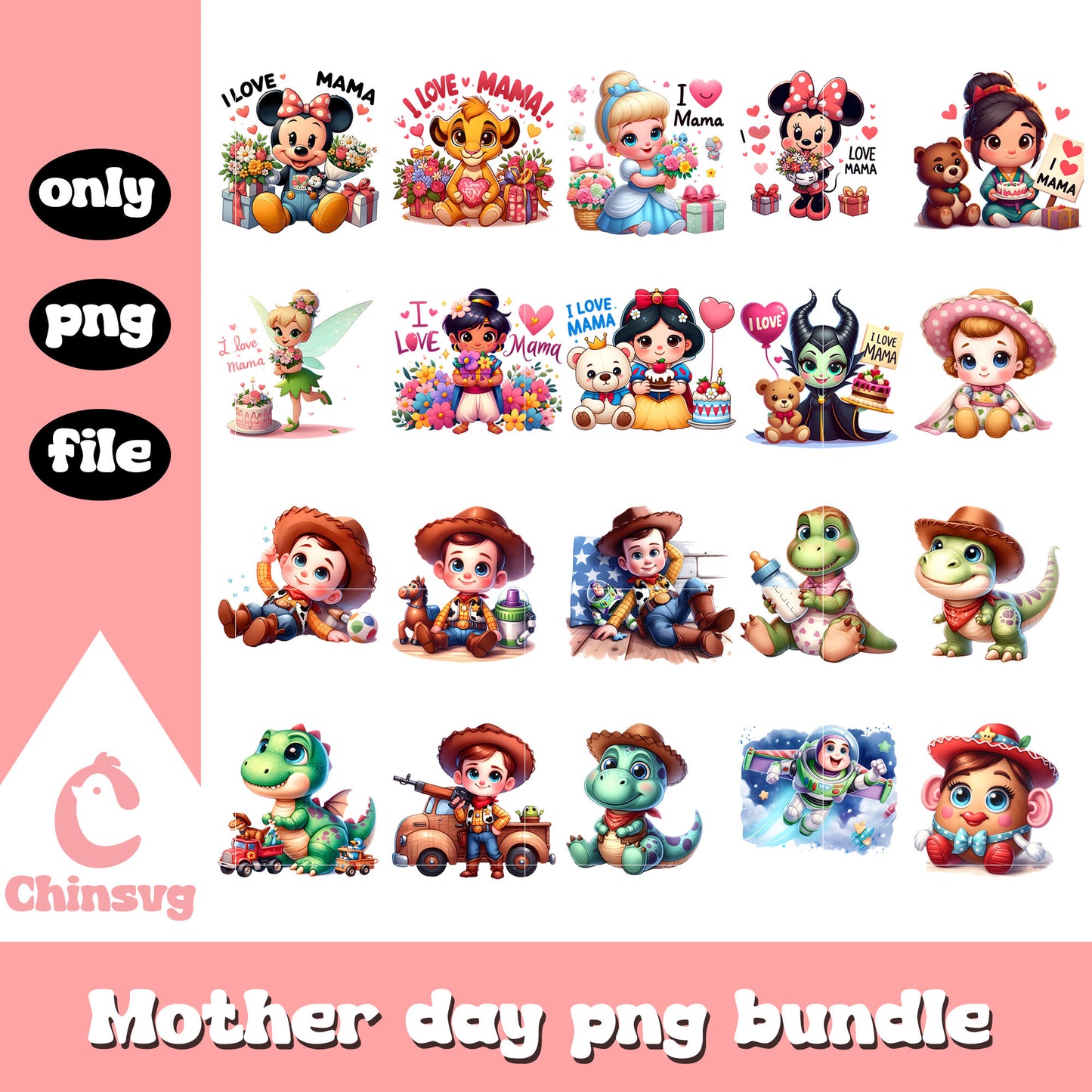 Cute chibi disney casts mother day bundle png, disney png, mother's day png