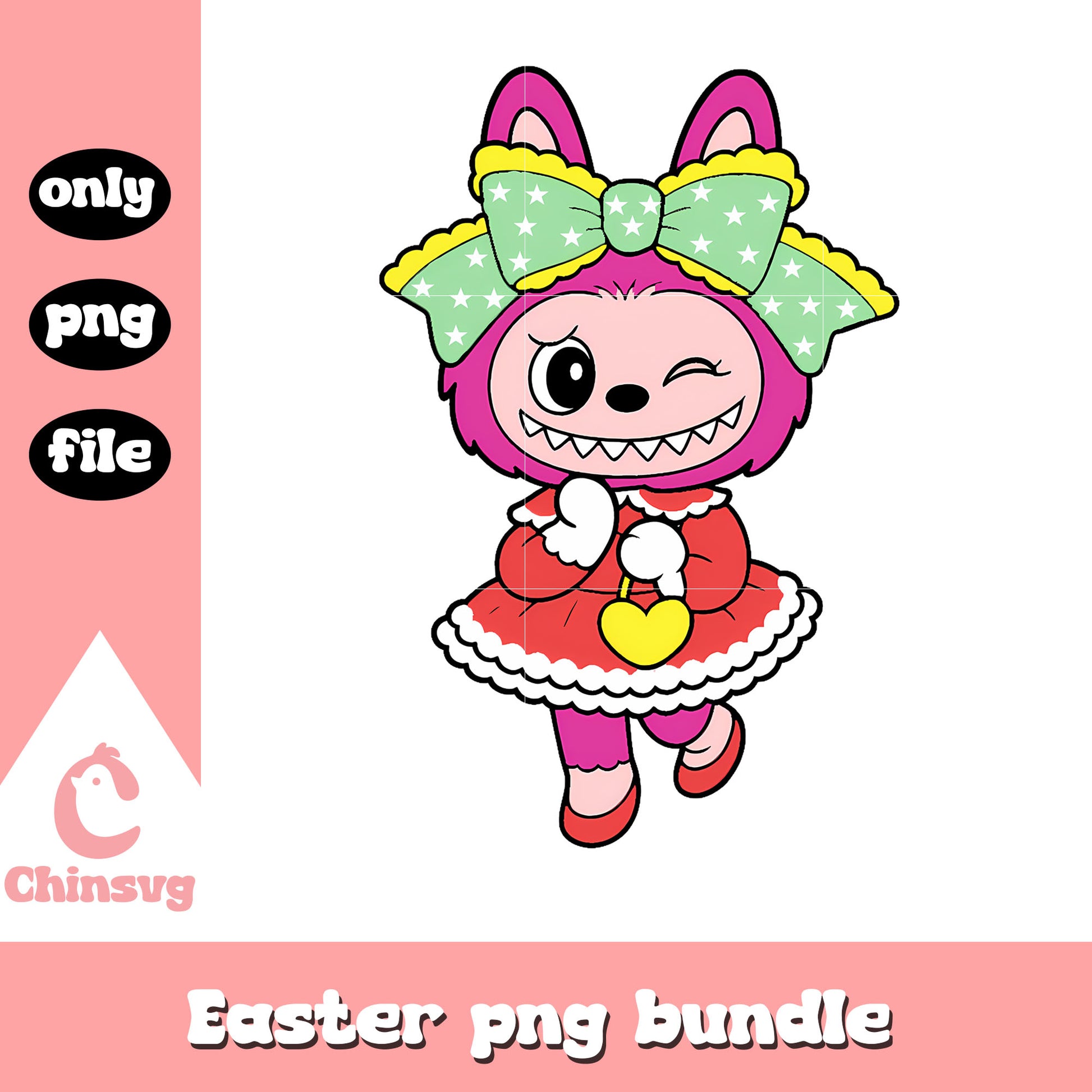 Dark pink winking bow girl labubu doll png, labubu clothes png
