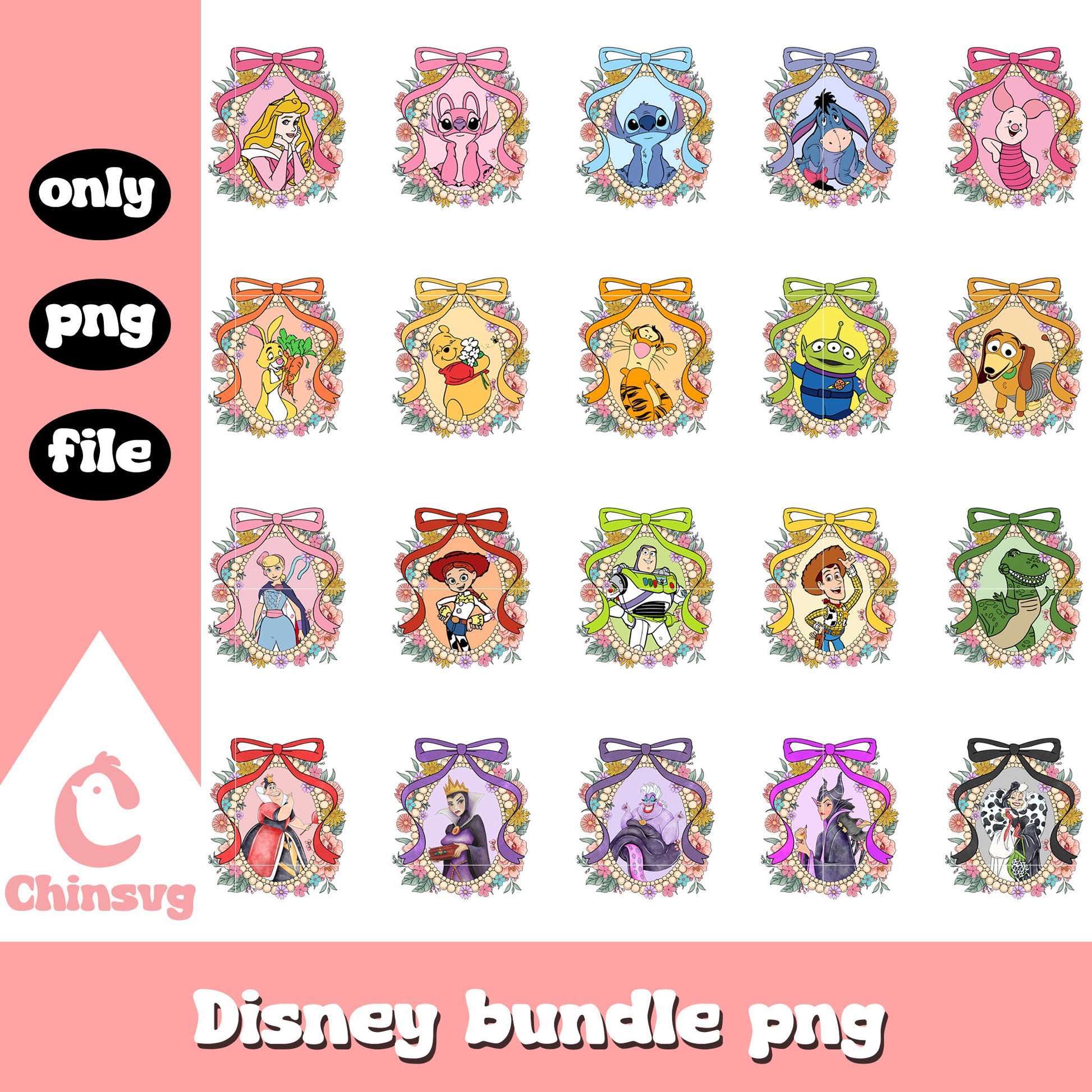 Disney movies characters bundle png is a product of our Disney collection. Perfect for Disney fans of all ages, this collection captures the charm and nostalgia of your favorite characters and magical worlds. Featuring a range of beloved characters, castles, magical icons, and whimsical designs, these files are ideal for creating everything from custom apparel to party decorations and personalized gifts.