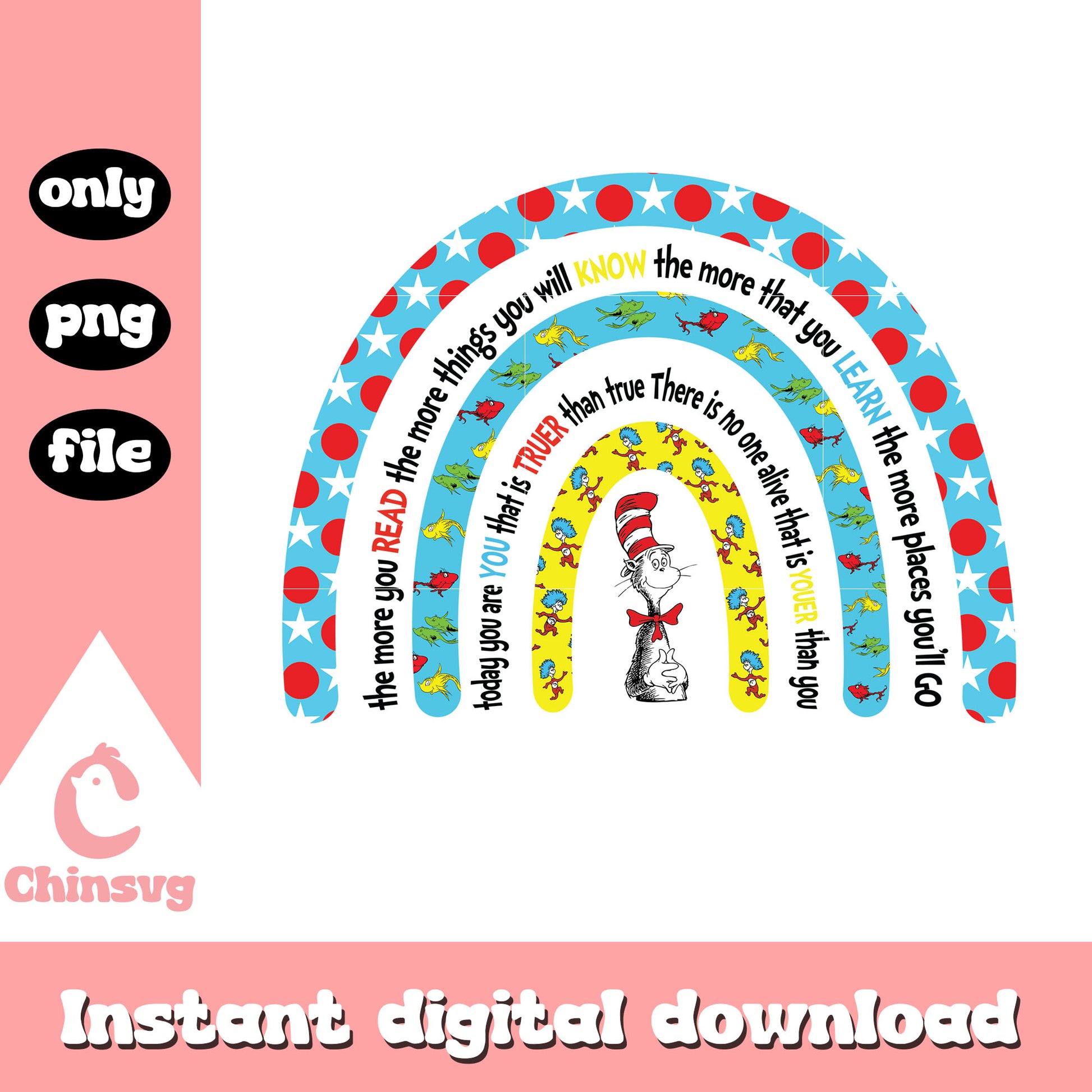 Dr Seuss rainbow quotes png is a product of our Dr seuss collection. inspired by the beloved books and characters that have enchanted generations! Featuring iconic designs of The Cat in the Hat, Horton, Thing 1 & Thing 2, and more, along with memorable quotes and whimsical elements, this collection is perfect for crafting unique projects that spark joy and creativity.