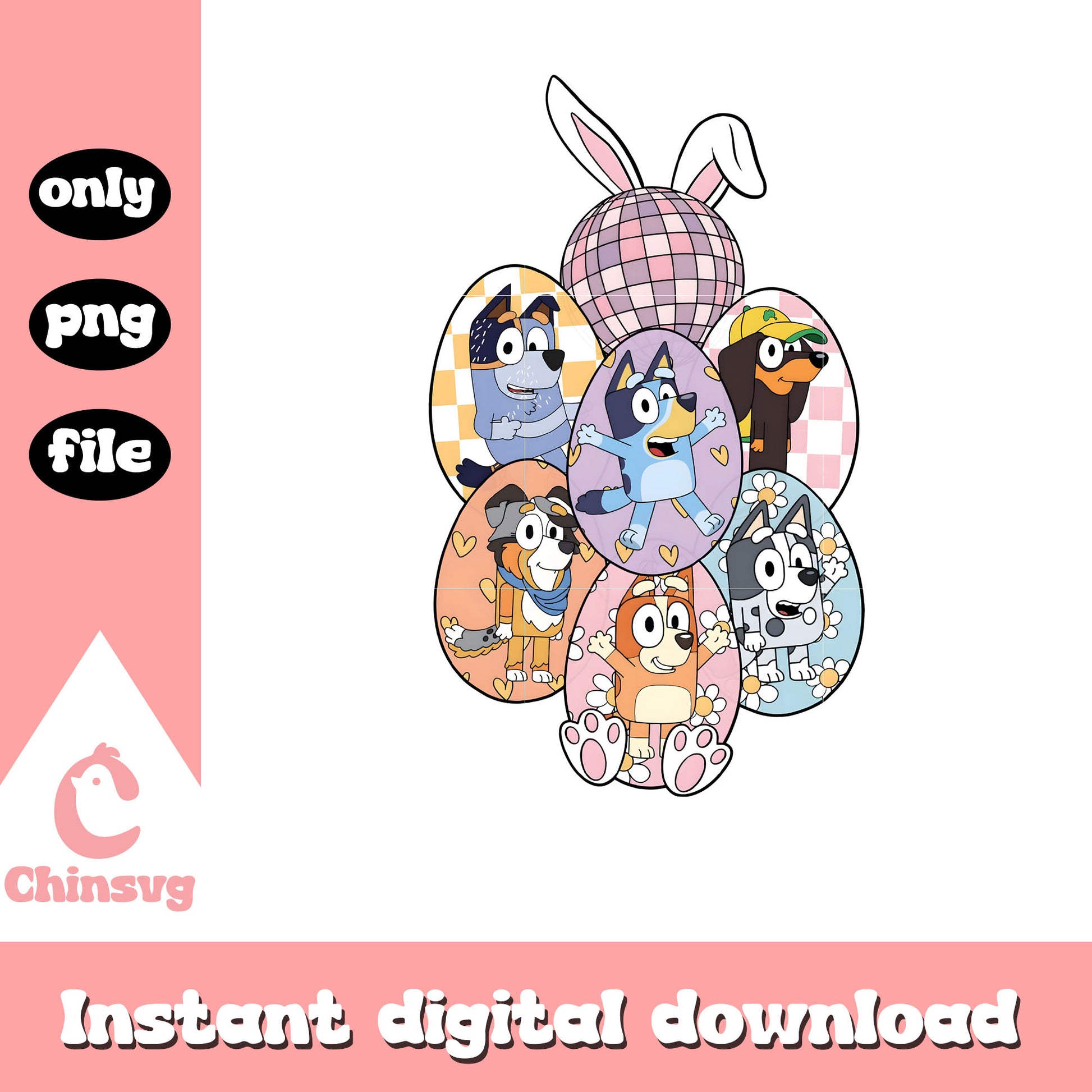 Easter eggs bluey and friends design png is a product of our Bluey collection. Packed with vibrant, fun, and creative illustrations, this collection features a wide range of adorable characters, colorful icons, and lively scenes that will brighten up any project. Whether you’re designing for kids' parties, custom apparel, or digital art, these high-quality files are perfect for unleashing your creativity.