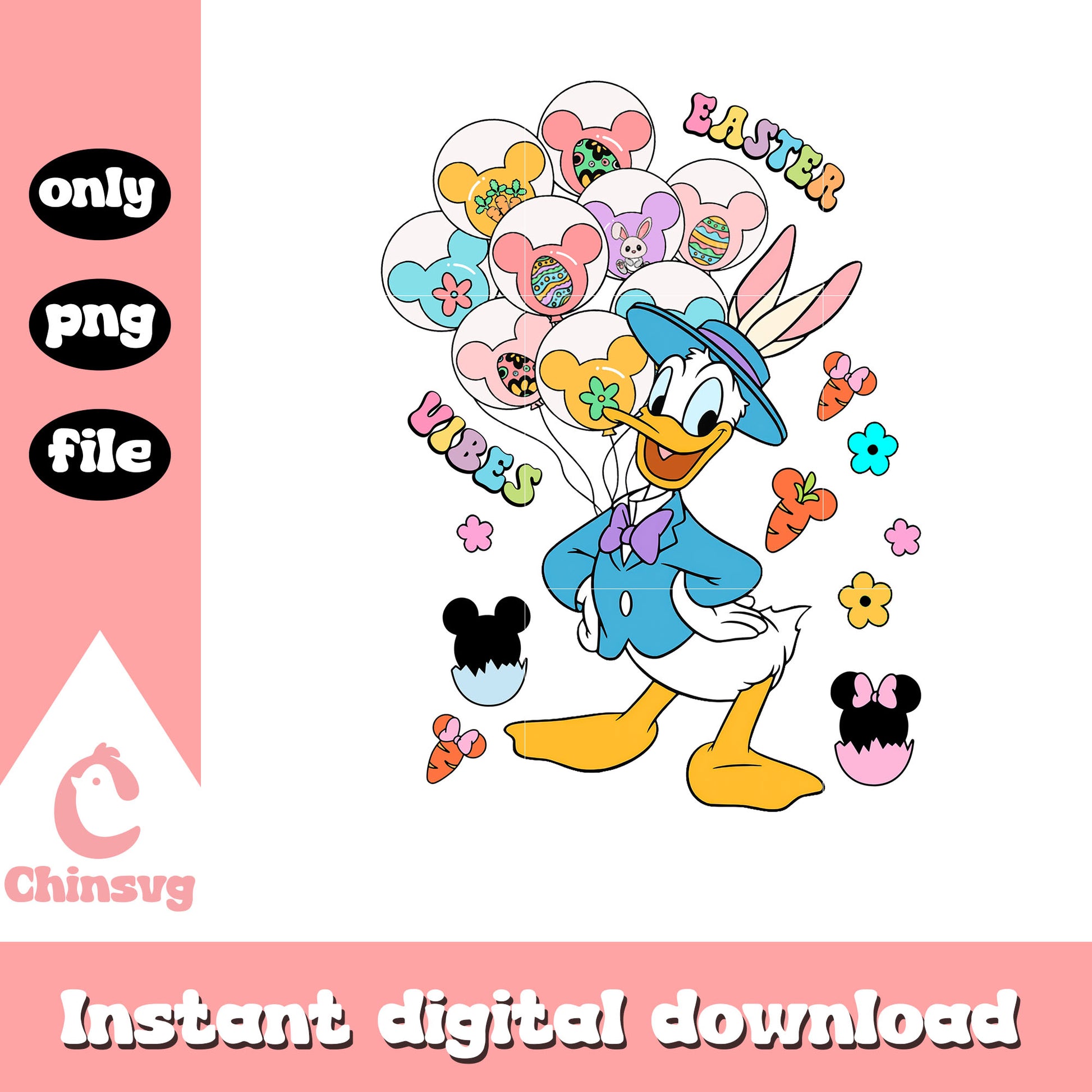 Easter vibes donald duck mickey balloon png is a product of our easter collection, filled with adorable and festive designs to make your creative projects shine! Featuring bunnies, Easter eggs, spring florals, and joyful quotes, this collection is perfect for crafting unique decorations, apparel, and gifts. Whether you’re preparing for an Easter egg hunt, decorating your home, or creating seasonal keepsakes, these high-quality designs are just what you need!
