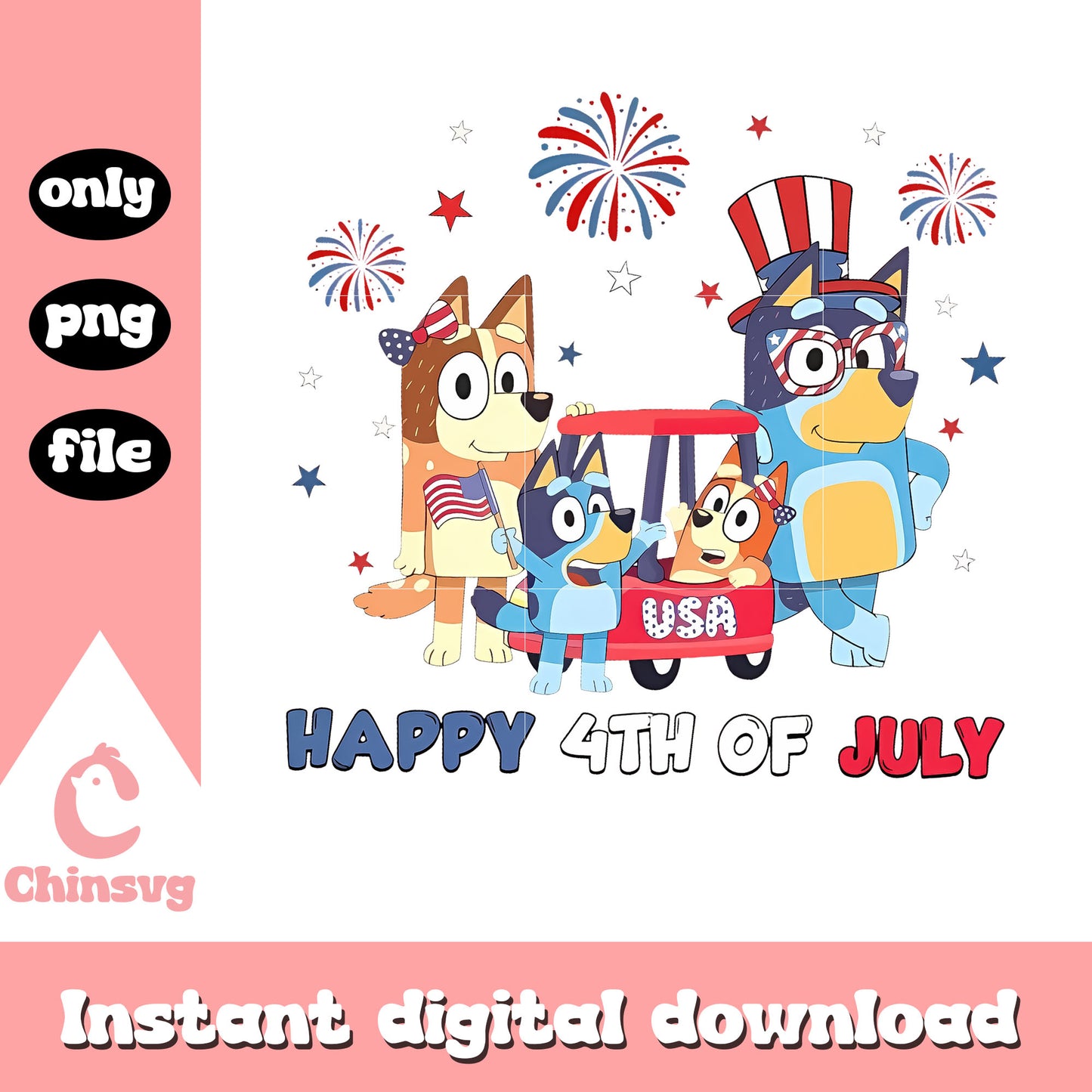 Family Heelers happy 4th of july png is a product of our Bluey collection. Packed with vibrant, fun, and creative illustrations, this collection features a wide range of adorable characters, colorful icons, and lively scenes that will brighten up any project. Whether you’re designing for kids' parties, custom apparel, or digital art, these high-quality files are perfect for unleashing your creativity.