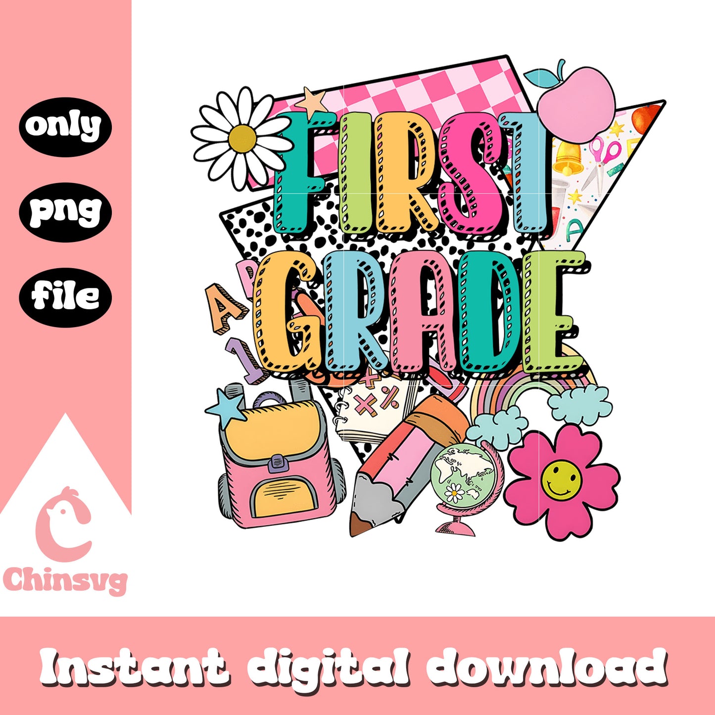 First grade back to school clipart png is a product of our School collection. Celebrate the spirit of learning with our School SVG Collection! Perfect for teachers, students, and parents, this collection features education-themed designs, from playful quotes and school supplies to classroom graphics and seasonal school moments. Whether you're personalizing a teacher gift or decorating for back-to-school, these high-quality files bring creativity to every classroom and craft project!