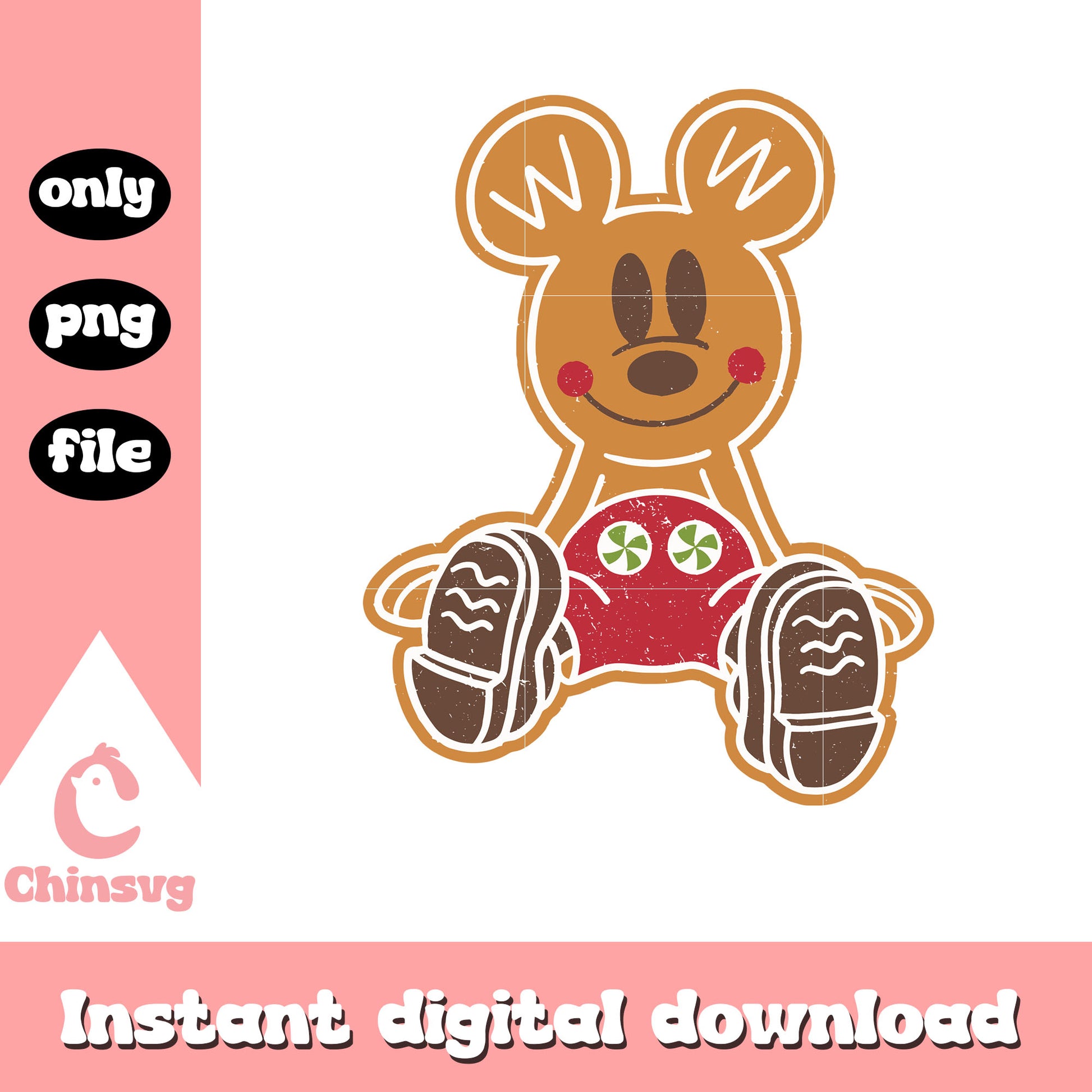 Gingerbread mickey mouse design png is a product of our christmas collection. Perfect for DIY enthusiasts, crafters, and designers, this collection offers a wide range of festive elements like Christmas trees, Santa Claus, snowflakes, ornaments, reindeer, and more. Whether you’re designing greeting cards, personalized gifts, or home decor, these high-quality designs will help you create something truly special this Christmas.