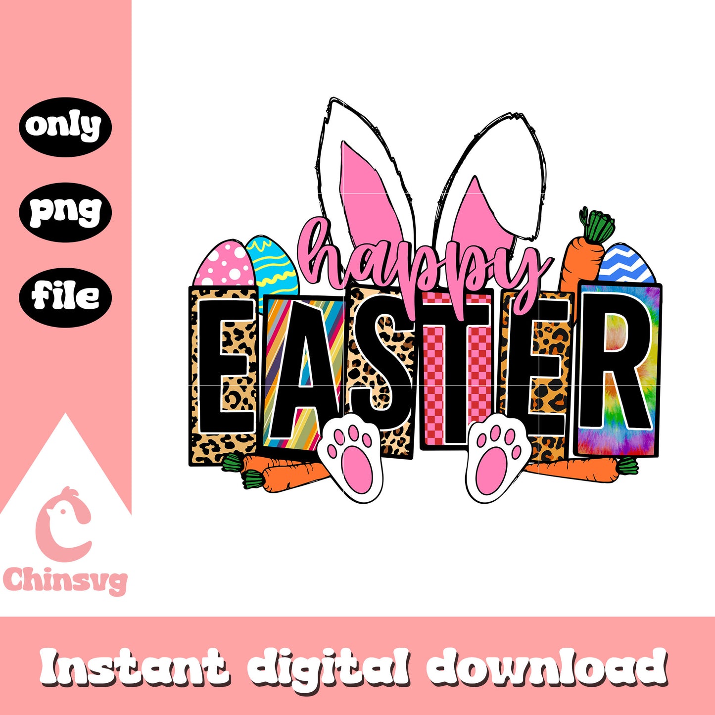 - A variety of Easter-themed elements: bunny ears, colorful eggs, Easter baskets, flowers, crosses, and holiday phrases.