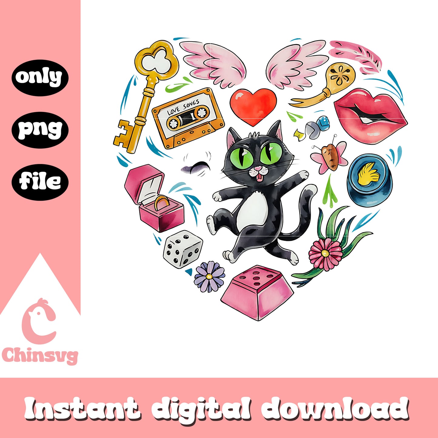 Heart valentine black cat doodle png, heart shape png, valentine png