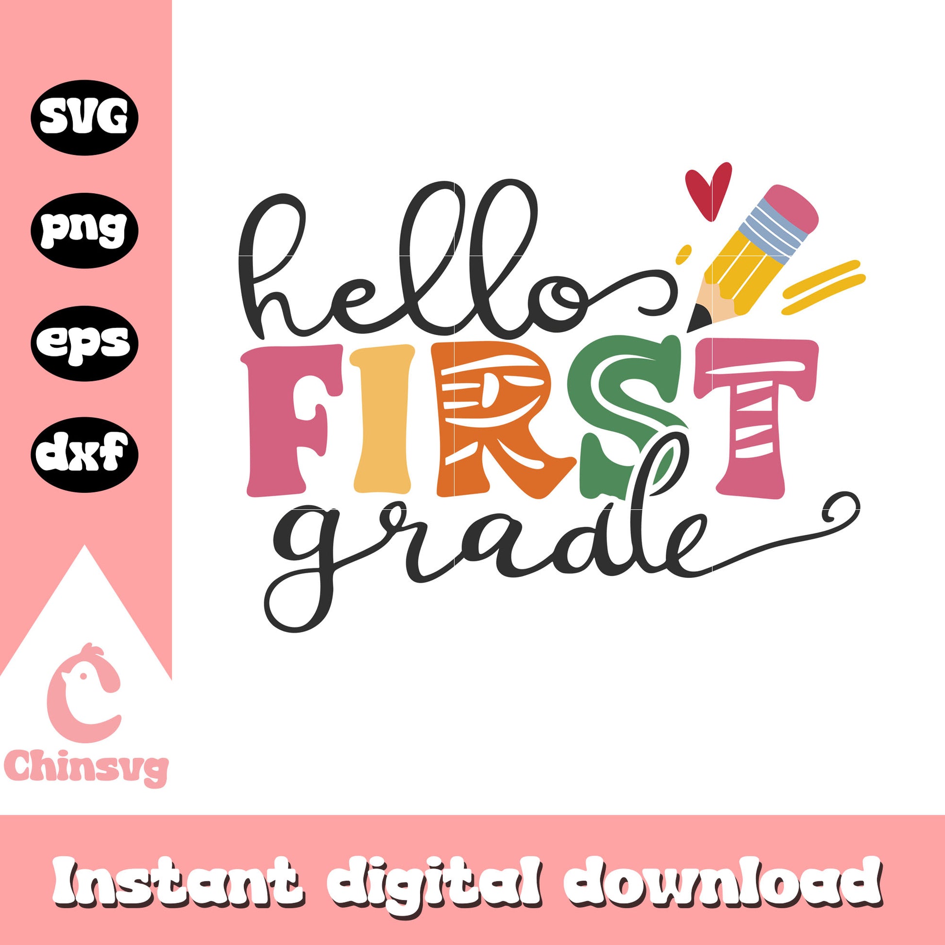 Hello first grade cute pencil design svg is a product of our School collection. Celebrate the spirit of learning with our School SVG Collection! Perfect for teachers, students, and parents, this collection features education-themed designs, from playful quotes and school supplies to classroom graphics and seasonal school moments. Whether you're personalizing a teacher gift or decorating for back-to-school, these high-quality files bring creativity to every classroom and craft project!