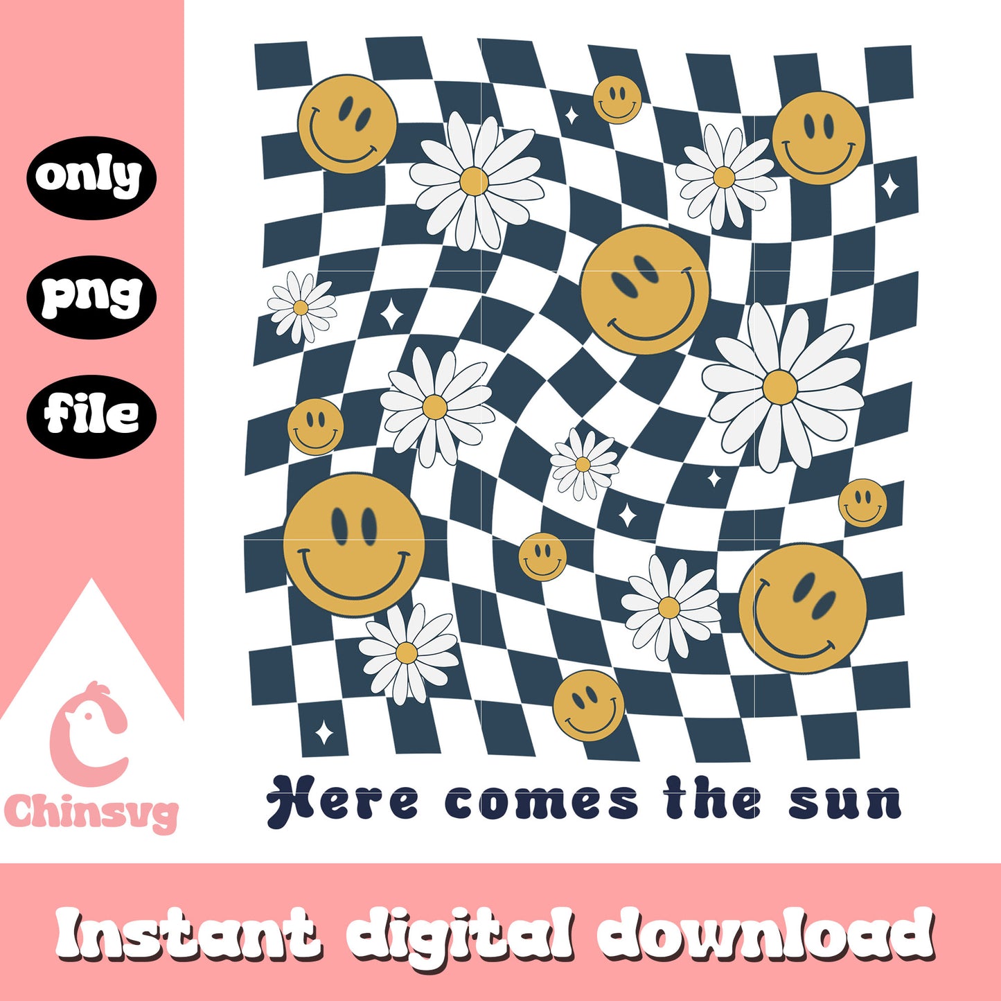 Here comes the sun daisy and smiley png, summer times png, quote png