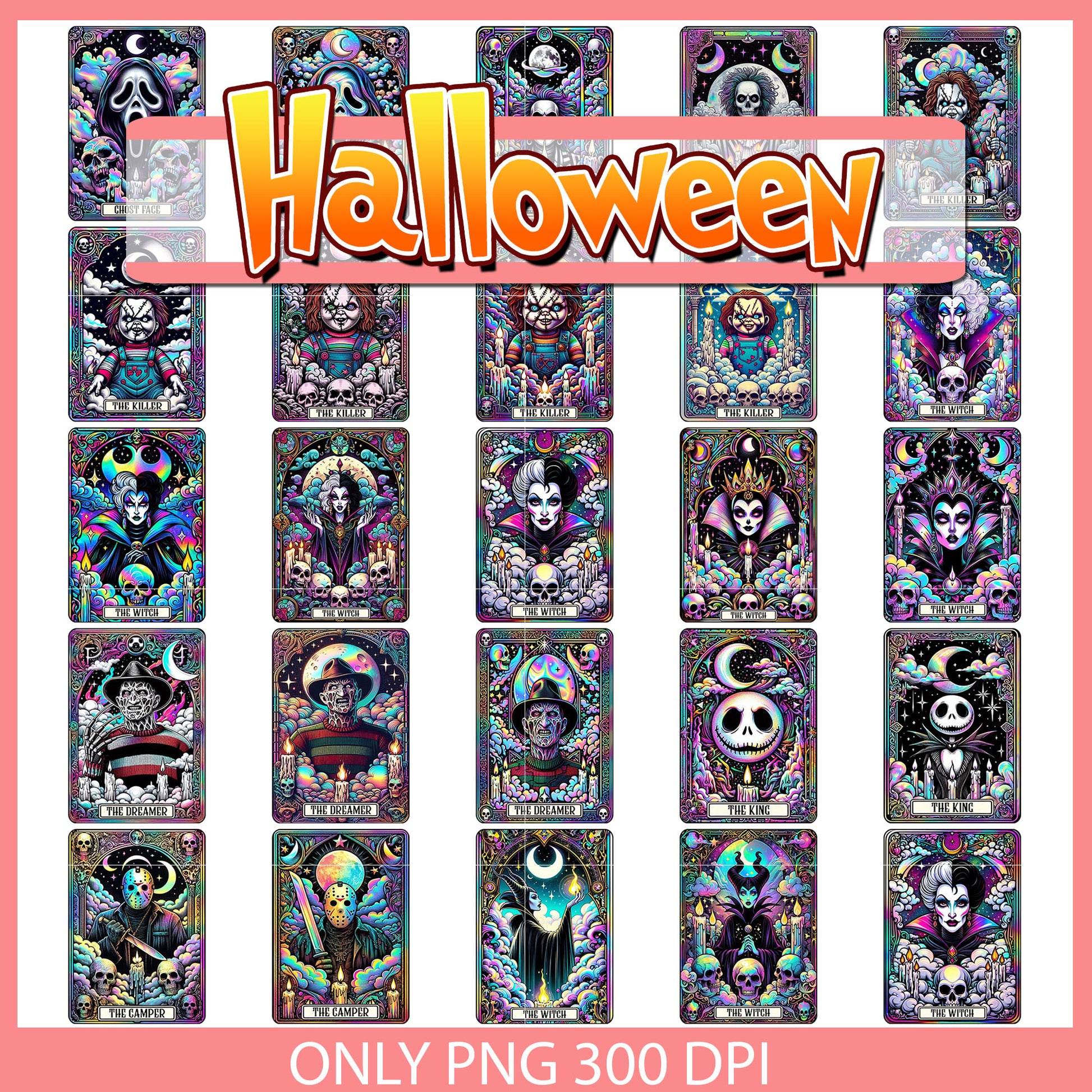 Horror characters tarot card bunlde png is a product of our Halloween collection. Whether you're crafting spooky decorations, designing party invitations, or creating unique apparel, this collection is packed with high-quality, detailed graphics that perfectly capture the spirit of Halloween. From pumpkins, ghosts, bats, to witches, skeletons, and more, this set offers endless possibilities for your creative ideas.