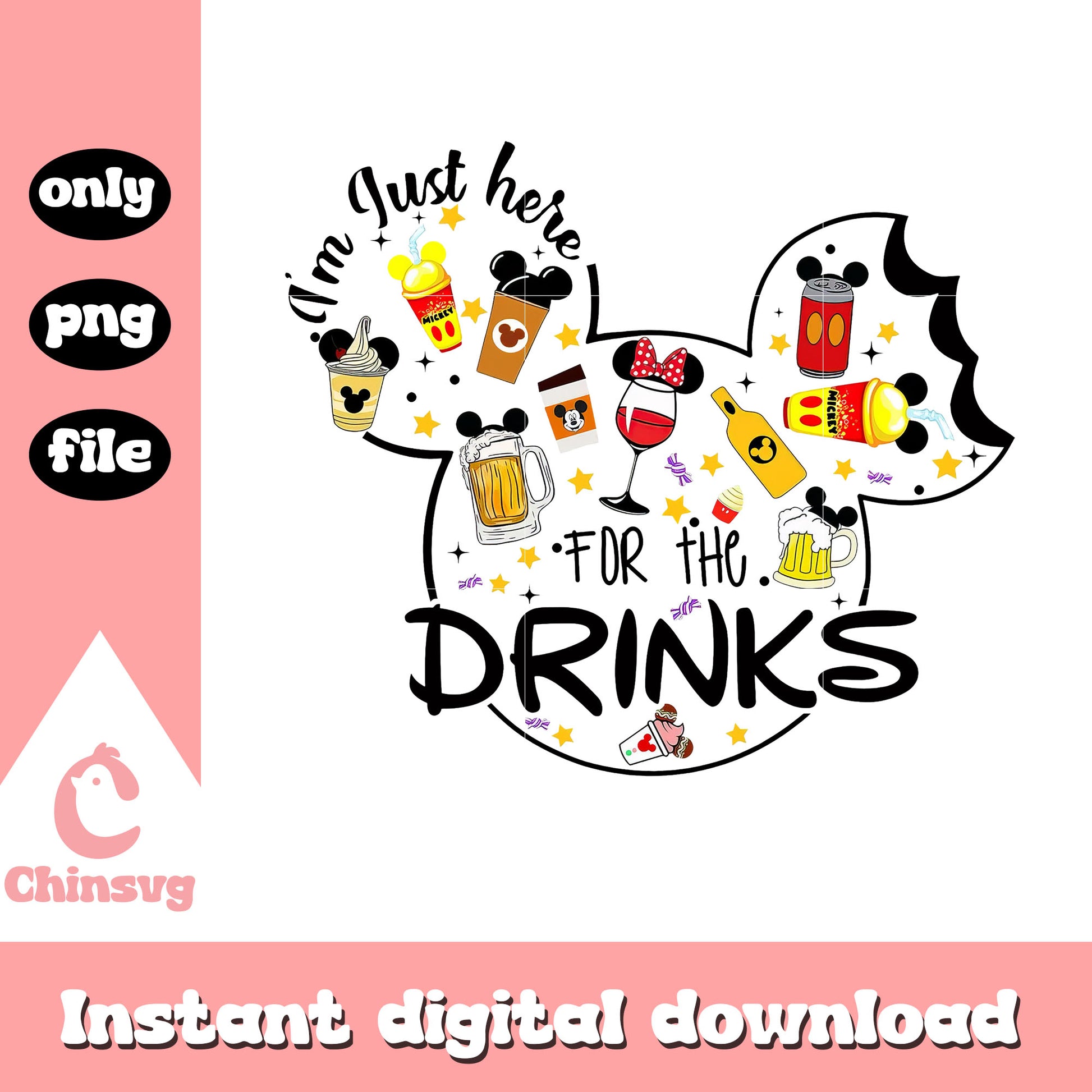 I'm just here for the drinks png is a product of our Disney collection. Perfect for Disney fans of all ages, this collection captures the charm and nostalgia of your favorite characters and magical worlds. Featuring a range of beloved characters, castles, magical icons, and whimsical designs, these files are ideal for creating everything from custom apparel to party decorations and personalized gifts.