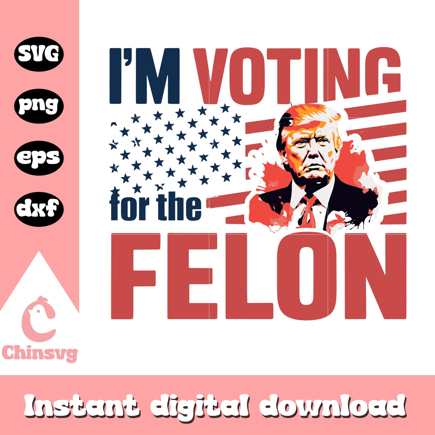 I'm voting for the felon trump design svg is a product of our Trump collection. Designed for those who want to make a bold impact. Perfect for a range of projects, this collection includes iconic portraits, patriotic symbols, and popular slogans associated with the Trump era. Whether you're creating custom apparel, banners, stickers, or social media content, these high-quality designs offer a unique way to express your perspective.