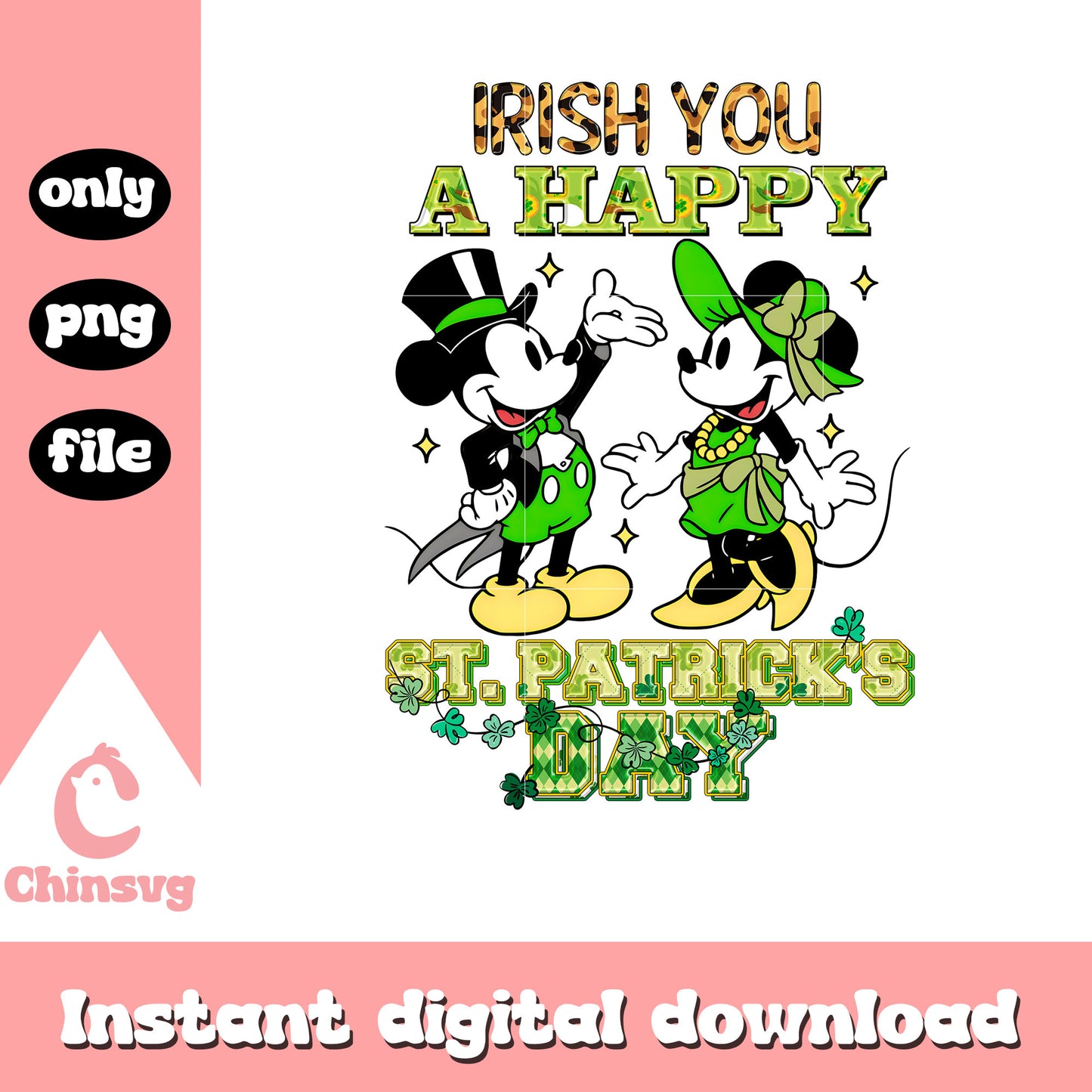 Irish you a happy mickey minnie png is a product of our St patrick's day collection. Packed with festive designs, this collection features lucky clovers, leprechauns, rainbows, hats, mugs of beer, and all things green and gold. Perfect for crafting custom decorations, apparel, and gifts, these high-quality files are ideal for adding a touch of Irish cheer to your creative projects.