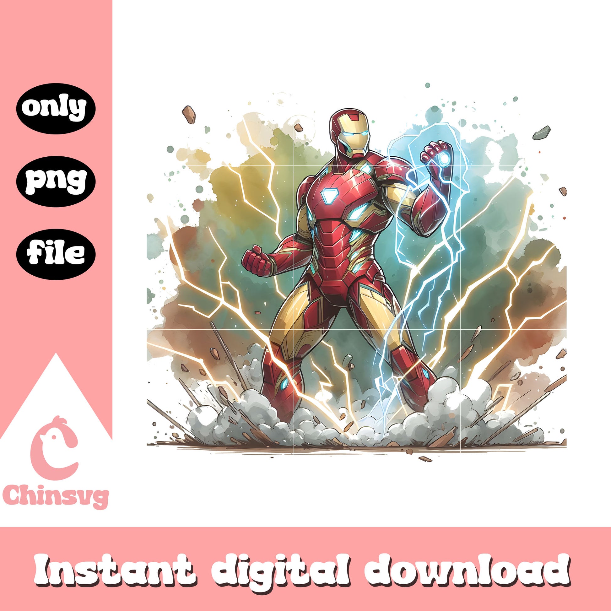 Iron man thunder posing splatter effect png is a product of our Avengers collection. Featuring your favorite Marvel superheroes like Iron Man, Captain America, Thor, Hulk, Black Widow, and more, this collection is perfect for fans, party planners, and creators who want to add heroic flair to their designs. Whether you're crafting for kids or grown-up Marvel lovers, this set brings action and excitement to every project.