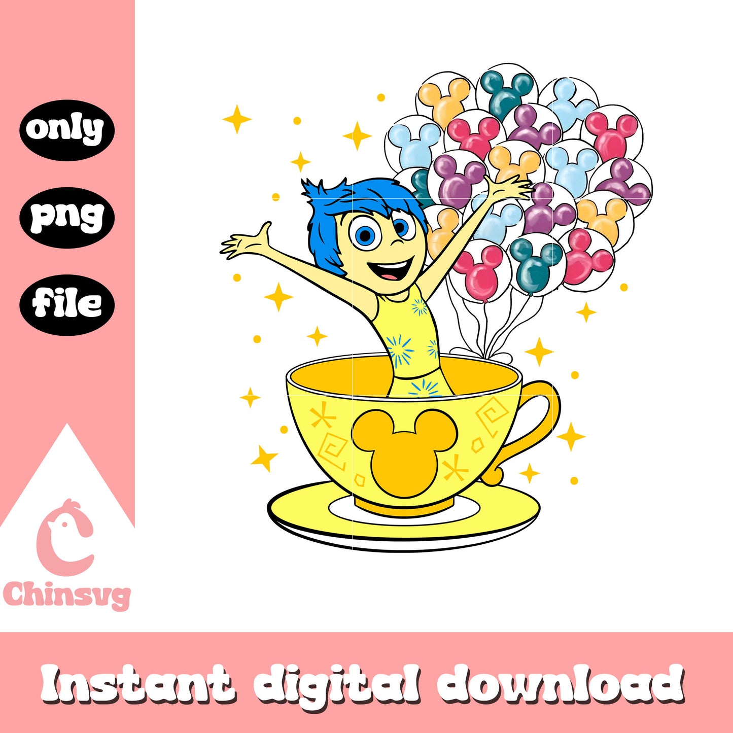Joy character tea cup balloon png is a product of our Disney collection. Perfect for Disney fans of all ages, this collection captures the charm and nostalgia of your favorite characters and magical worlds. Featuring a range of beloved characters, castles, magical icons, and whimsical designs, these files are ideal for creating everything from custom apparel to party decorations and personalized gifts.