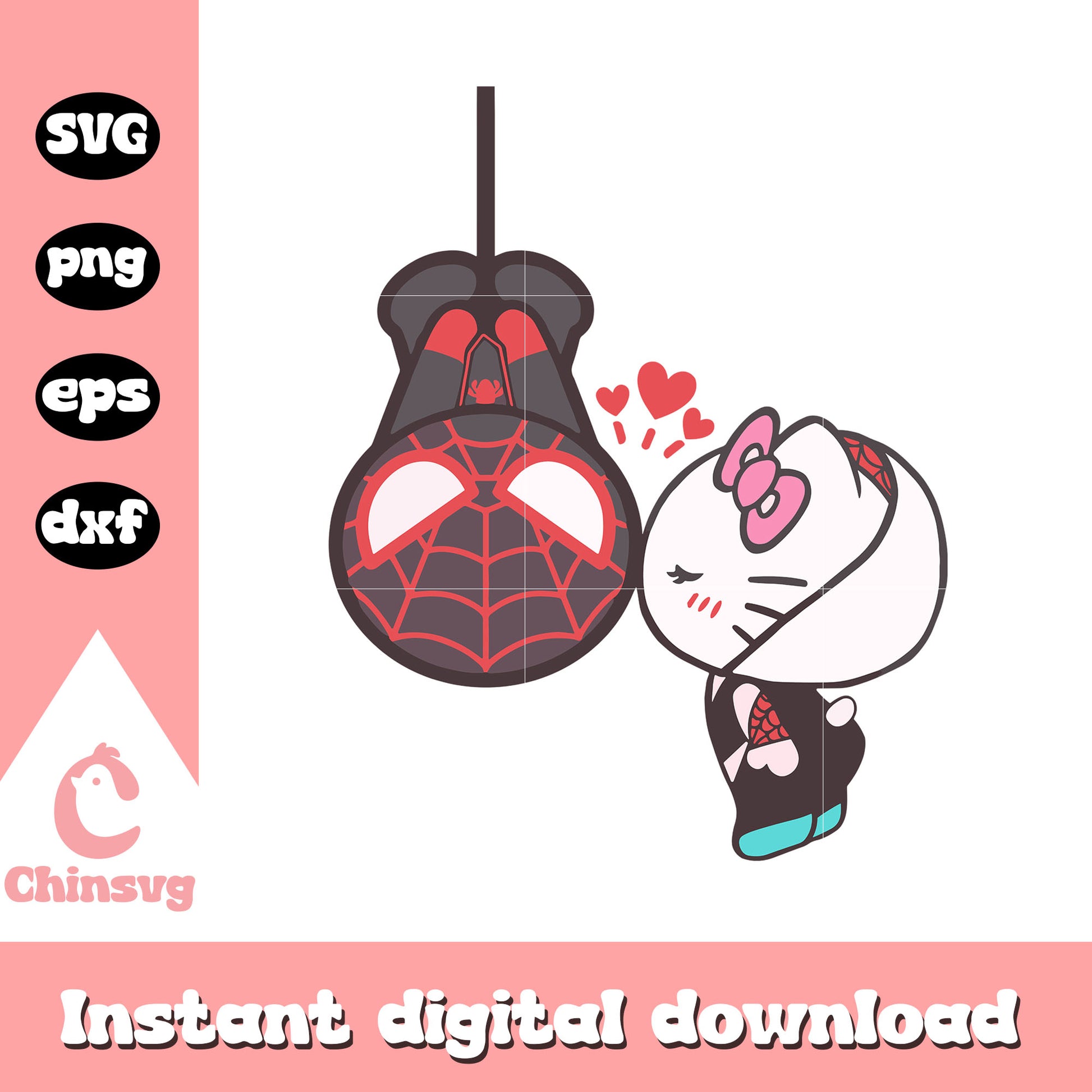 Kitty kissing spider man black svg is a product of our hello kitty collection. Featuring the beloved character and her charming world, this collection is perfect for fans, crafters, and designers of all ages. Whether you're creating party decorations, custom gifts, or digital artwork, these high-quality designs will make every project extra cute and memorable.