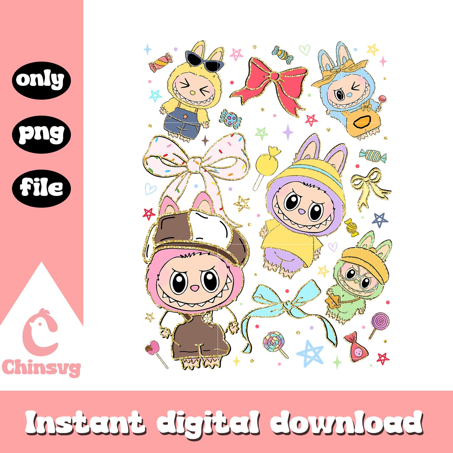 Labubu dolls bow emotions costumes design png, labubu drawing png