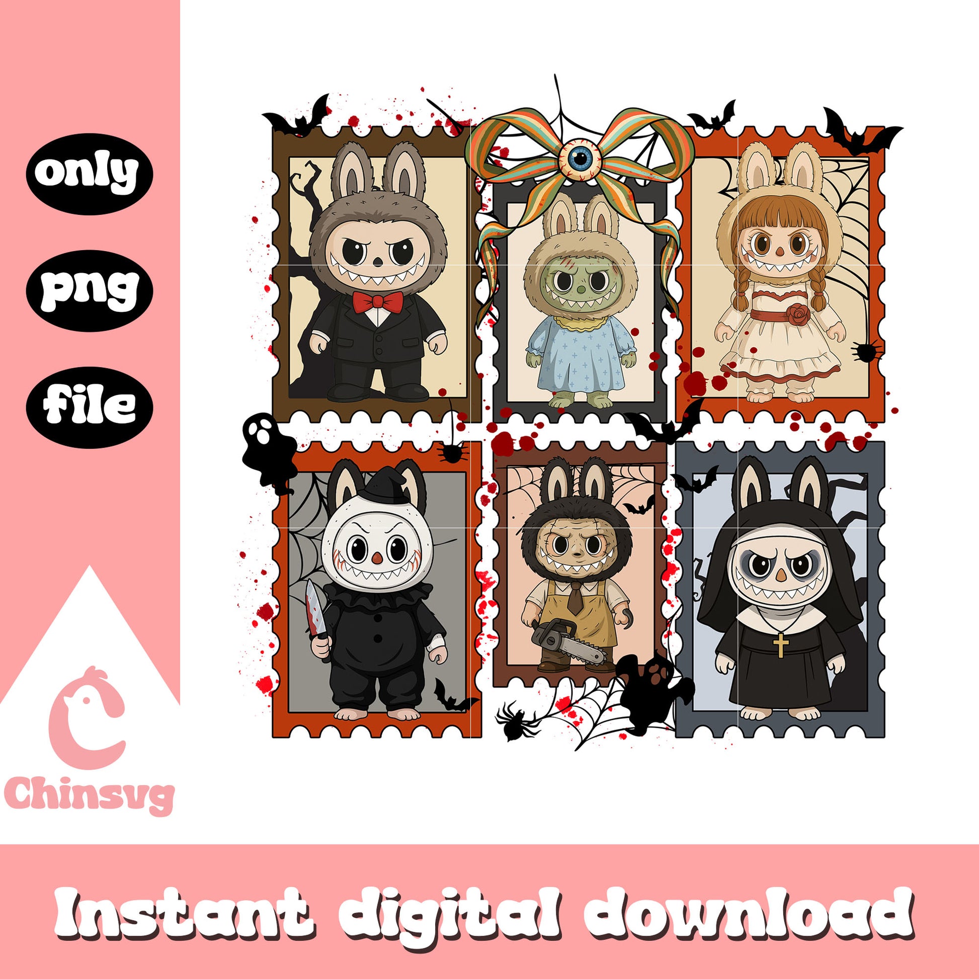 Labubu halloween horror characters costumes design png is a product of our Halloween collection. Whether you're crafting spooky decorations, designing party invitations, or creating unique apparel, this collection is packed with high-quality, detailed graphics that perfectly capture the spirit of Halloween. From pumpkins, ghosts, bats, to witches, skeletons, and more, this set offers endless possibilities for your creative ideas.