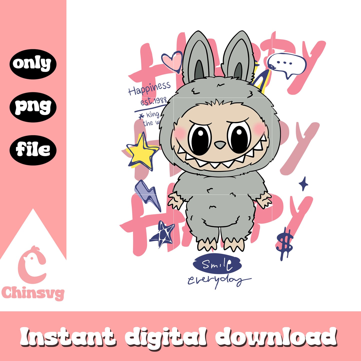 Labubu happiness everyday art design png is a product of our Labubu collection. Dive into the magical world of Labubu with our whimsical Labubu SVG Collection! Inspired by the beloved mischievous character from the POP MART universe, this collection is filled with playful poses, expressive faces, and cute yet edgy vibes. Perfect for fans, collectors, and crafters looking to add a touch of artistic charm and character to their projects.