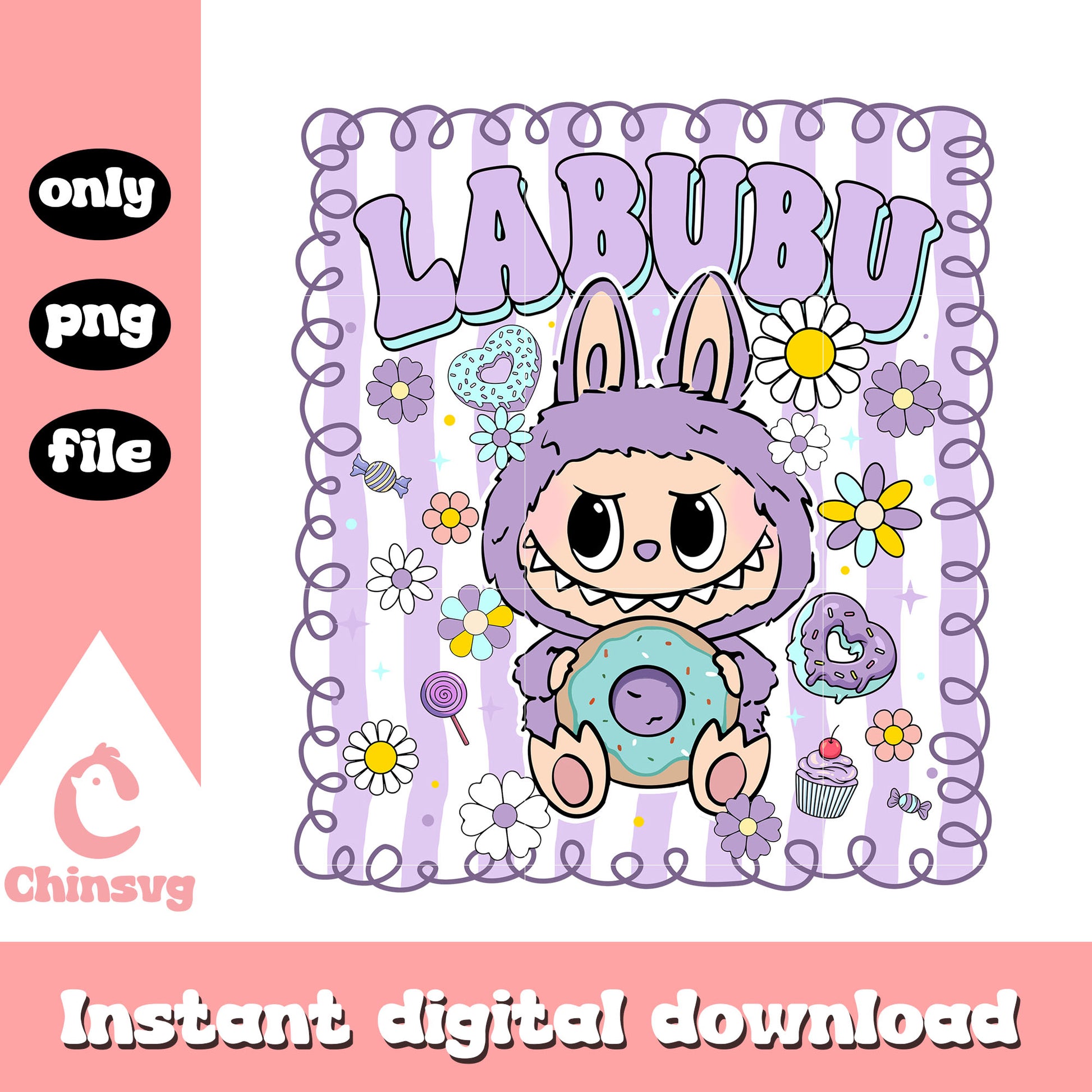 Labubu purple doll holding donut frame design png is a product of our Labubu collection. Dive into the magical world of Labubu with our whimsical Labubu SVG Collection! Inspired by the beloved mischievous character from the POP MART universe, this collection is filled with playful poses, expressive faces, and cute yet edgy vibes. Perfect for fans, collectors, and crafters looking to add a touch of artistic charm and character to their projects.