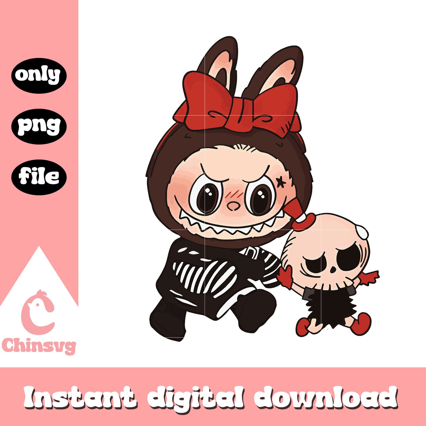 Labubu skeleton suit with red bow and tycoco design png is a product of our Labubu collection. Dive into the magical world of Labubu with our whimsical Labubu SVG Collection! Inspired by the beloved mischievous character from the POP MART universe, this collection is filled with playful poses, expressive faces, and cute yet edgy vibes. Perfect for fans, collectors, and crafters looking to add a touch of artistic charm and character to their projects.