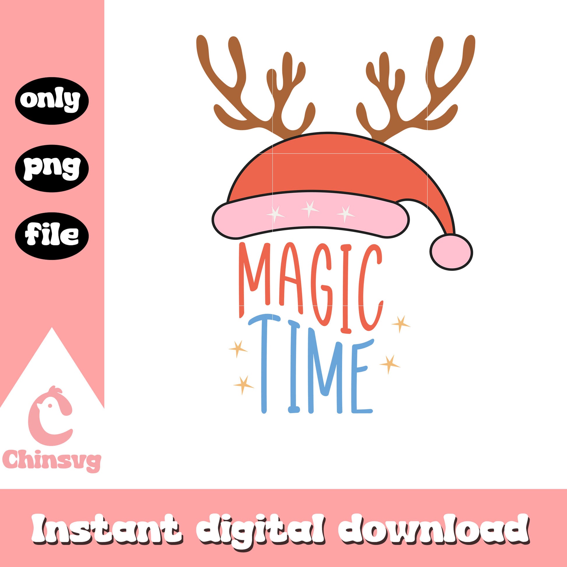 Magic time santa hat reindeer png is a product of our christmas collection. Perfect for DIY enthusiasts, crafters, and designers, this collection offers a wide range of festive elements like Christmas trees, Santa Claus, snowflakes, ornaments, reindeer, and more. Whether you’re designing greeting cards, personalized gifts, or home decor, these high-quality designs will help you create something truly special this Christmas.