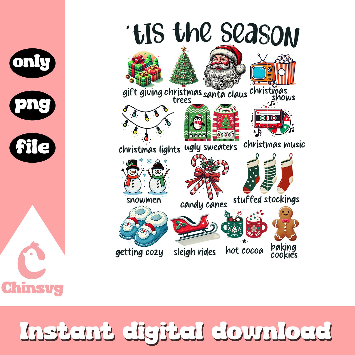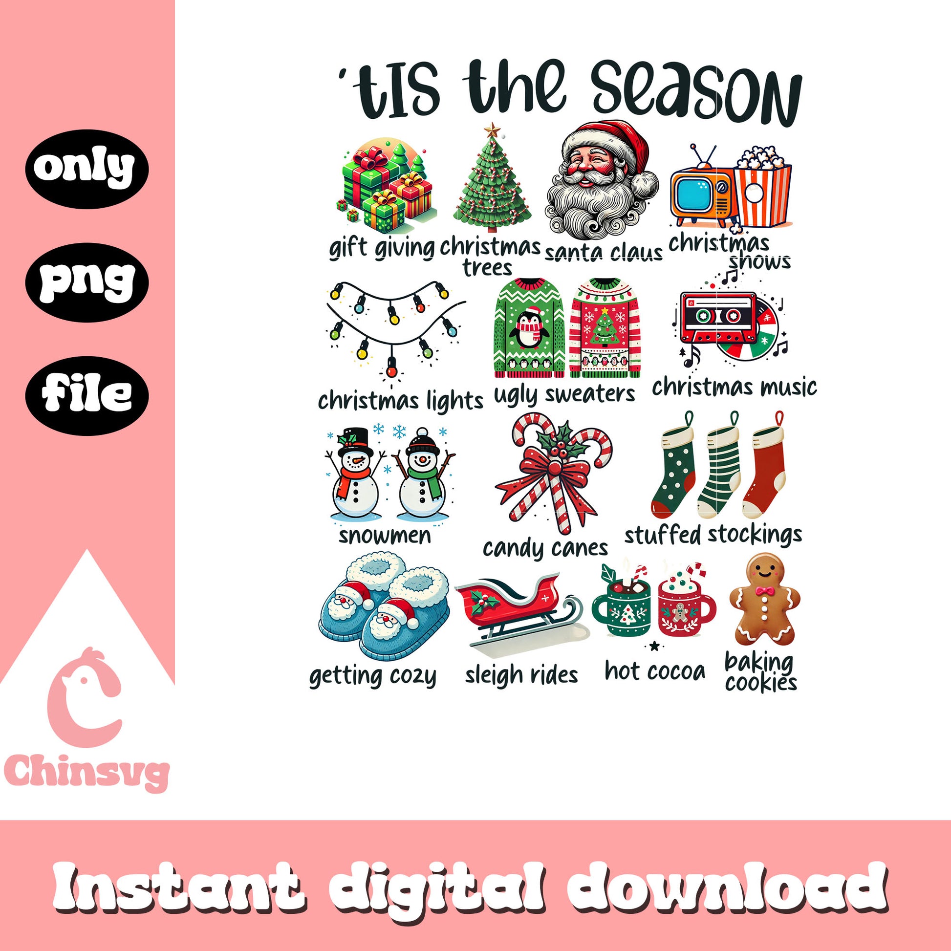 Merry christmas tis the season design png is a product of our christmas collection. Perfect for DIY enthusiasts, crafters, and designers, this collection offers a wide range of festive elements like Christmas trees, Santa Claus, snowflakes, ornaments, reindeer, and more. Whether you’re designing greeting cards, personalized gifts, or home decor, these high-quality designs will help you create something truly special this Christmas.