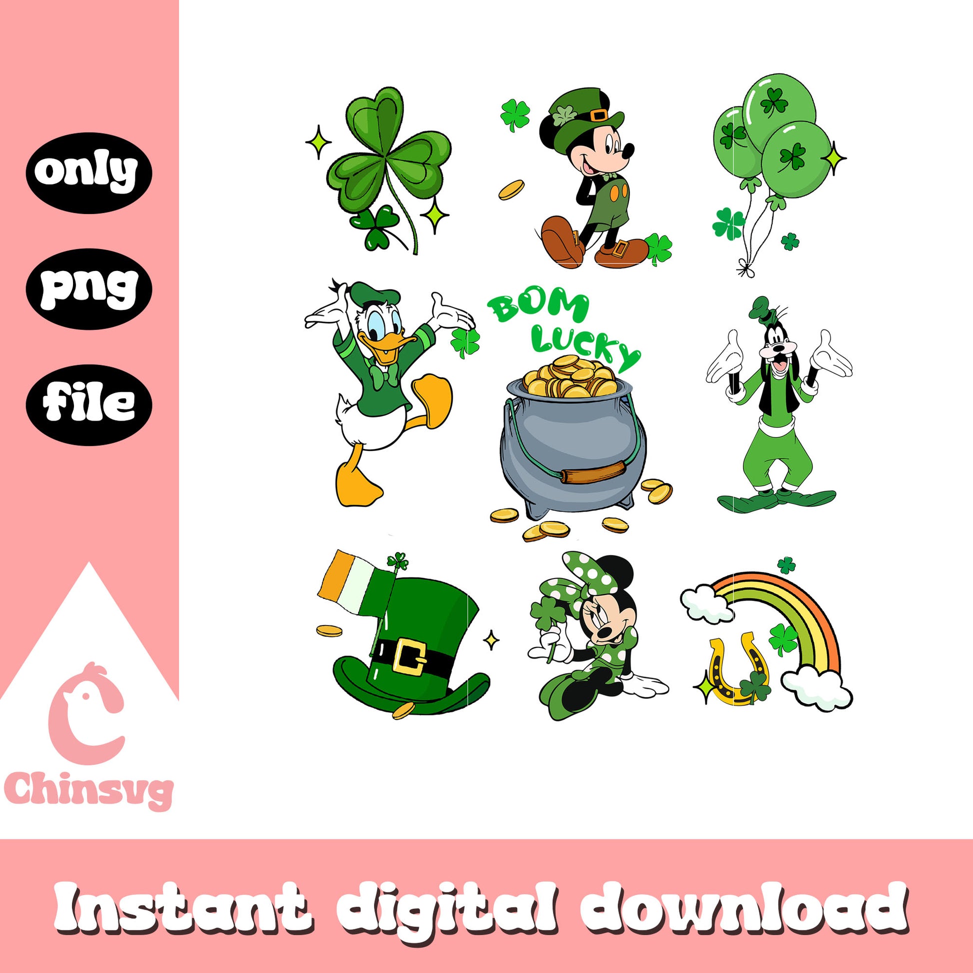Mickey and friends bom lucky png is a product of our St patrick's day collection. Packed with festive designs, this collection features lucky clovers, leprechauns, rainbows, hats, mugs of beer, and all things green and gold. Perfect for crafting custom decorations, apparel, and gifts, these high-quality files are ideal for adding a touch of Irish cheer to your creative projects.