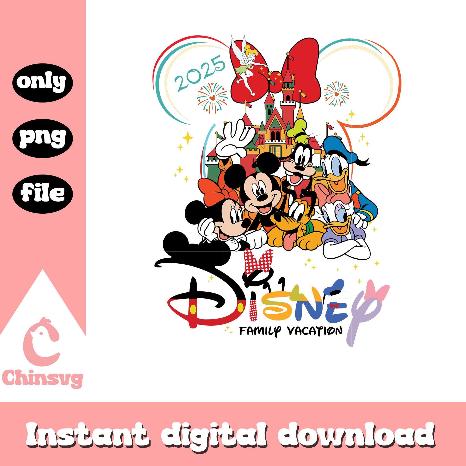 Mickey and friends disney family vacation png is a product of our Disney collection. Perfect for Disney fans of all ages, this collection captures the charm and nostalgia of your favorite characters and magical worlds. Featuring a range of beloved characters, castles, magical icons, and whimsical designs, these files are ideal for creating everything from custom apparel to party decorations and personalized gifts.
