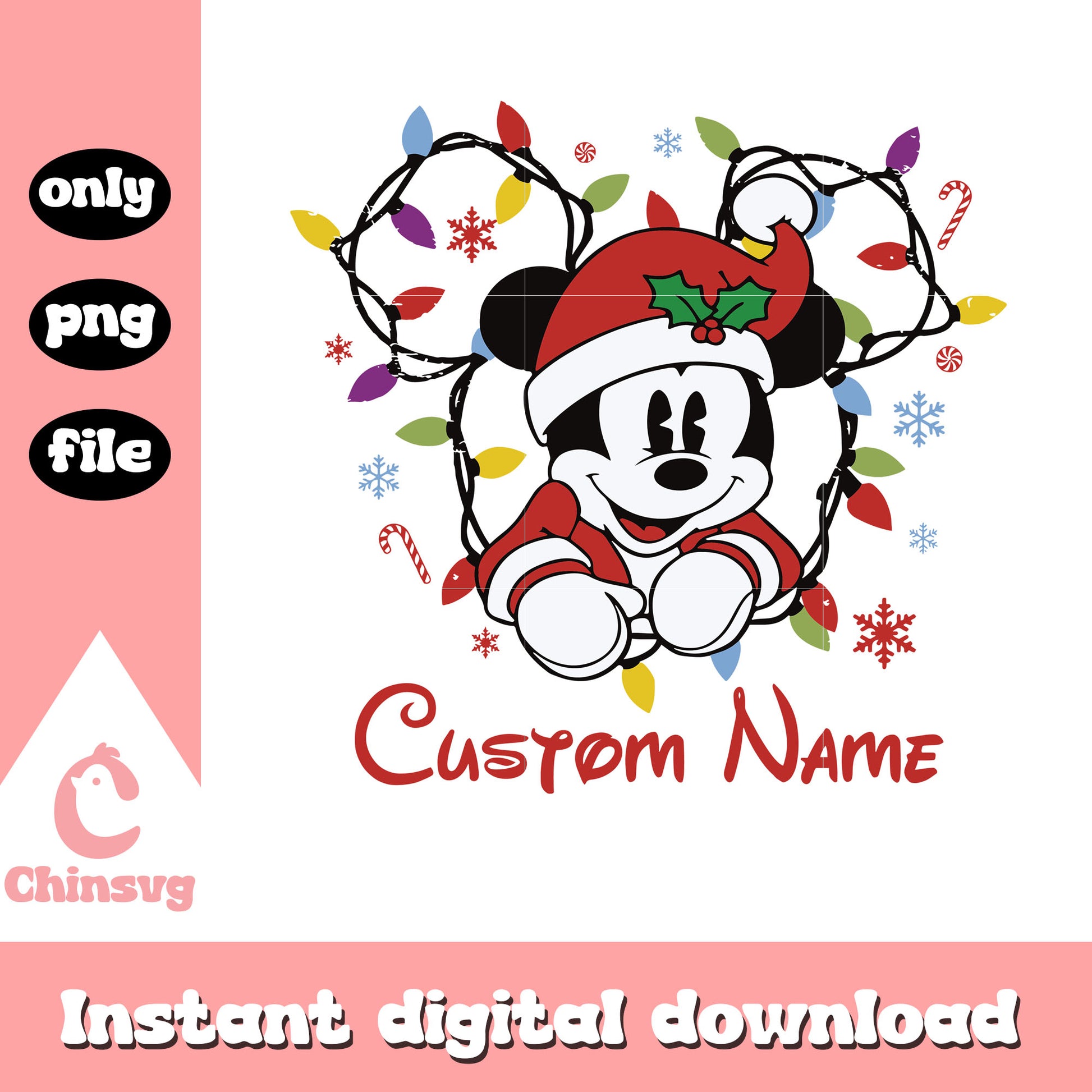 Mickey mouse custom name christmas png is a product of our christmas collection. Perfect for DIY enthusiasts, crafters, and designers, this collection offers a wide range of festive elements like Christmas trees, Santa Claus, snowflakes, ornaments, reindeer, and more. Whether you’re designing greeting cards, personalized gifts, or home decor, these high-quality designs will help you create something truly special this Christmas.