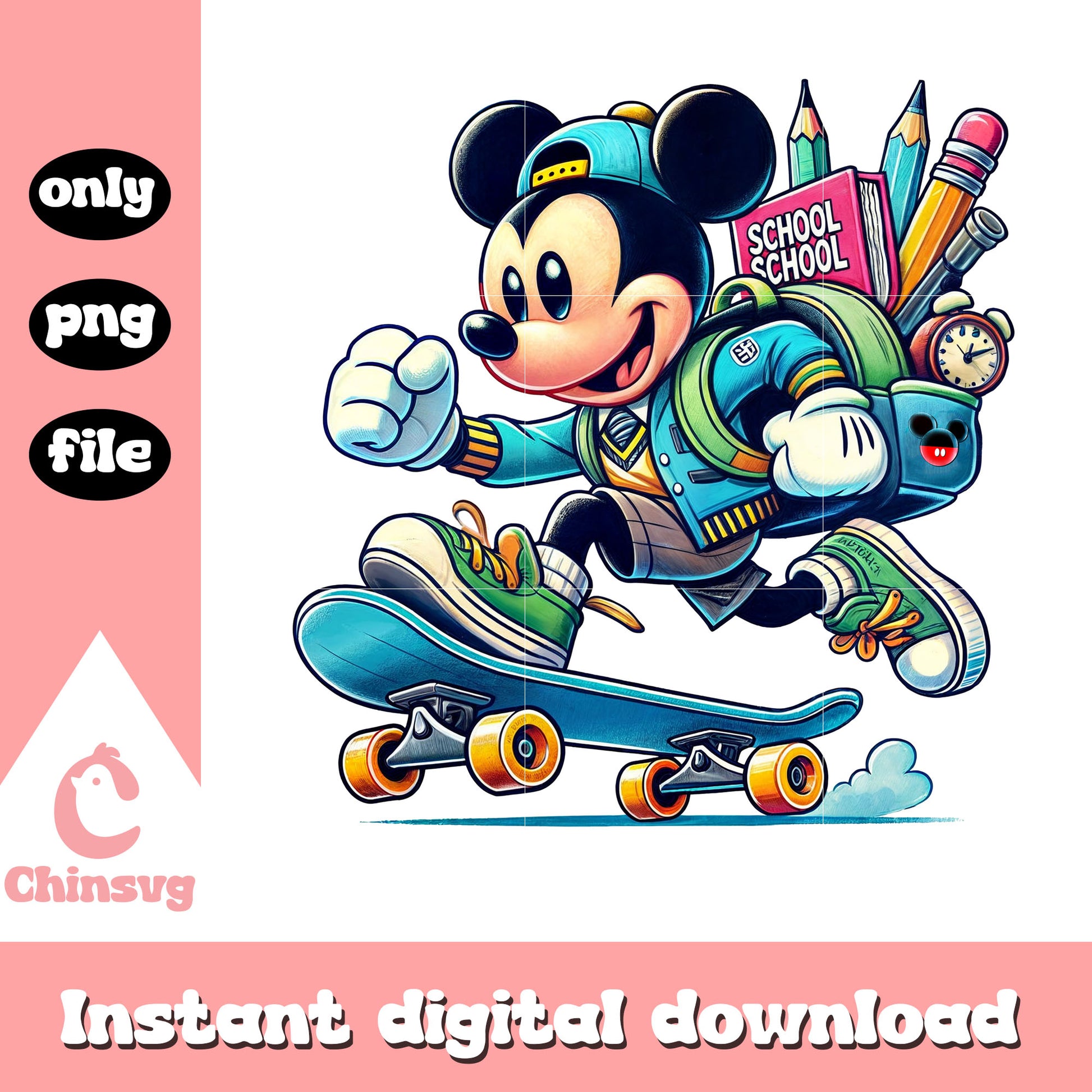 Mickey skateboarding to school design png is a product of our School collection. Celebrate the spirit of learning with our School SVG Collection! Perfect for teachers, students, and parents, this collection features education-themed designs, from playful quotes and school supplies to classroom graphics and seasonal school moments. Whether you're personalizing a teacher gift or decorating for back-to-school, these high-quality files bring creativity to every classroom and craft project!