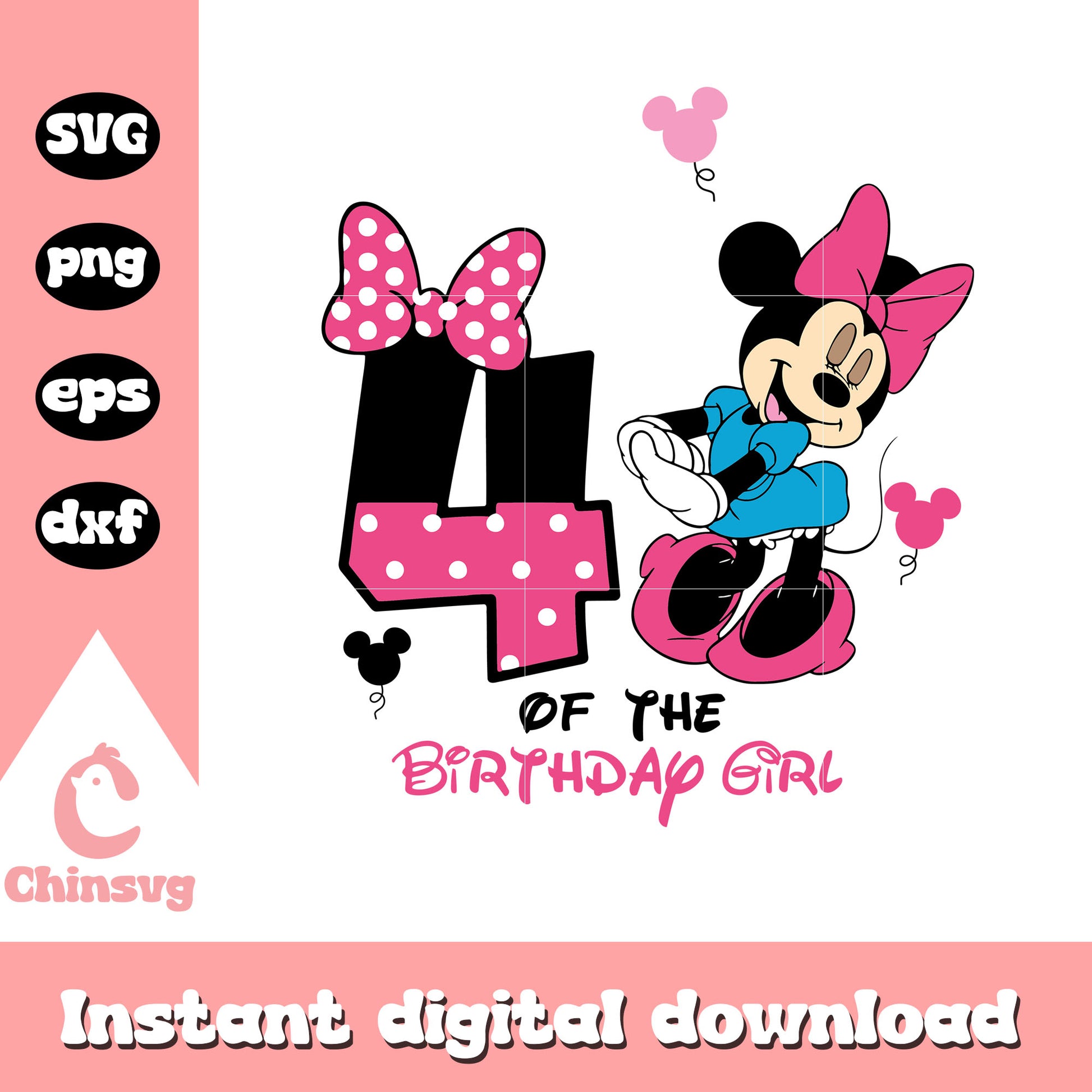 Minnie 4th of the birthday girl svg is a product of our Disney collection. Perfect for Disney fans of all ages, this collection captures the charm and nostalgia of your favorite characters and magical worlds. Featuring a range of beloved characters, castles, magical icons, and whimsical designs, these files are ideal for creating everything from custom apparel to party decorations and personalized gifts.