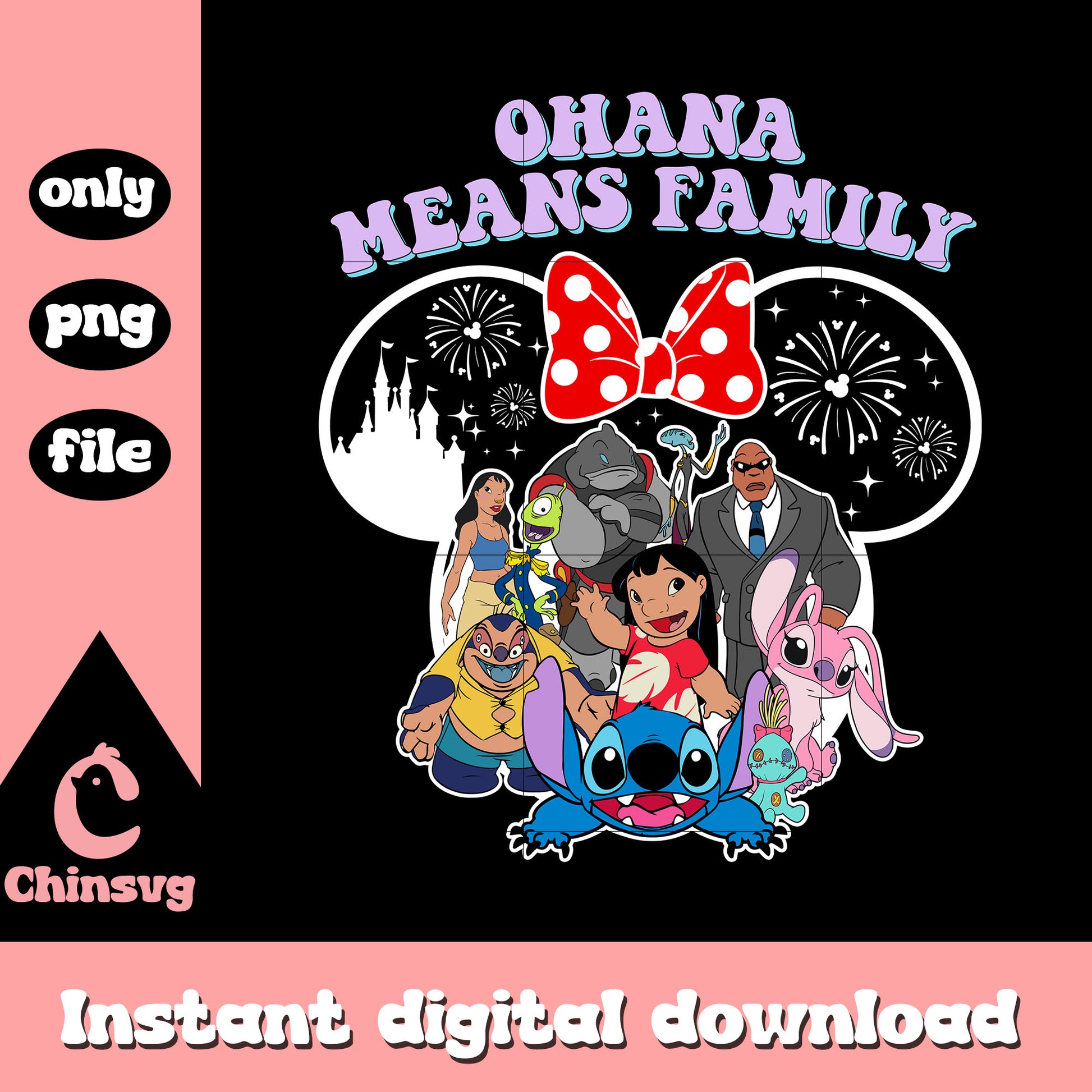 Ohana means family minnie ears png is a product of our Disney collection. Perfect for Disney fans of all ages, this collection captures the charm and nostalgia of your favorite characters and magical worlds. Featuring a range of beloved characters, castles, magical icons, and whimsical designs, these files are ideal for creating everything from custom apparel to party decorations and personalized gifts.