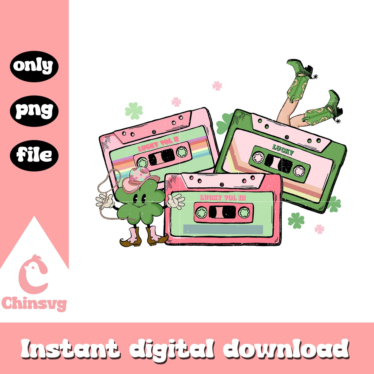 Patrick cassette lucky vol III png is a product of our St patrick's day collection. Packed with festive designs, this collection features lucky clovers, leprechauns, rainbows, hats, mugs of beer, and all things green and gold. Perfect for crafting custom decorations, apparel, and gifts, these high-quality files are ideal for adding a touch of Irish cheer to your creative projects.
