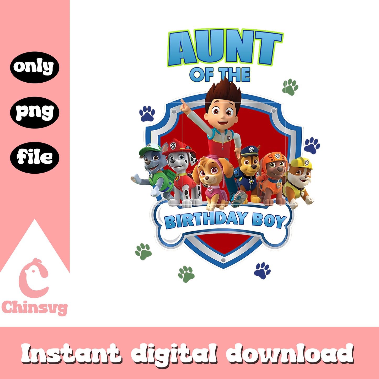Paw patrol aunt of the birthday boy png is a product of our Paw patrol collection. Featuring Chase, Marshall, Skye, Rubble, Zuma, Rocky, and Everest, along with paw prints, badges, and rescue-themed elements, this collection is perfect for creating playful and adventurous designs. Whether you’re crafting for birthdays, kids’ apparel, or themed decorations, these high-quality designs will make your projects Paw-some!