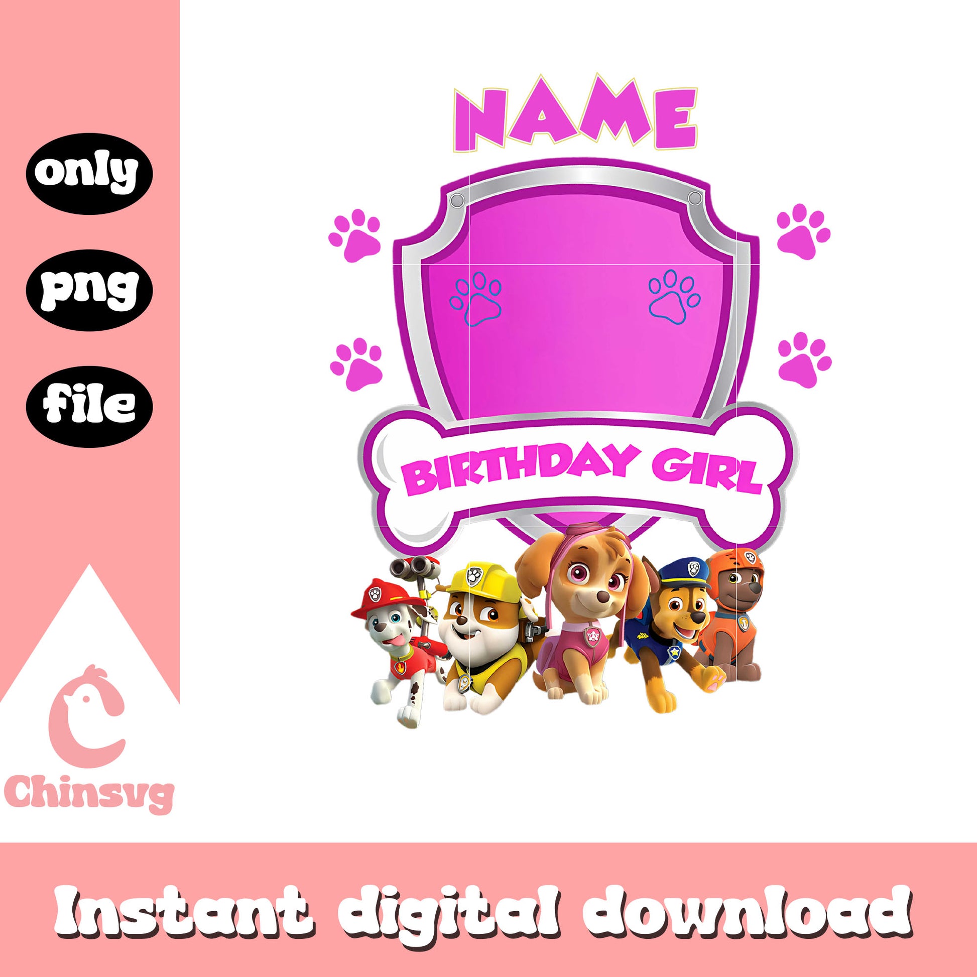 Paw patrol character name birthday girl png is a product of our Paw patrol collection. Featuring Chase, Marshall, Skye, Rubble, Zuma, Rocky, and Everest, along with paw prints, badges, and rescue-themed elements, this collection is perfect for creating playful and adventurous designs. Whether you’re crafting for birthdays, kids’ apparel, or themed decorations, these high-quality designs will make your projects Paw-some!