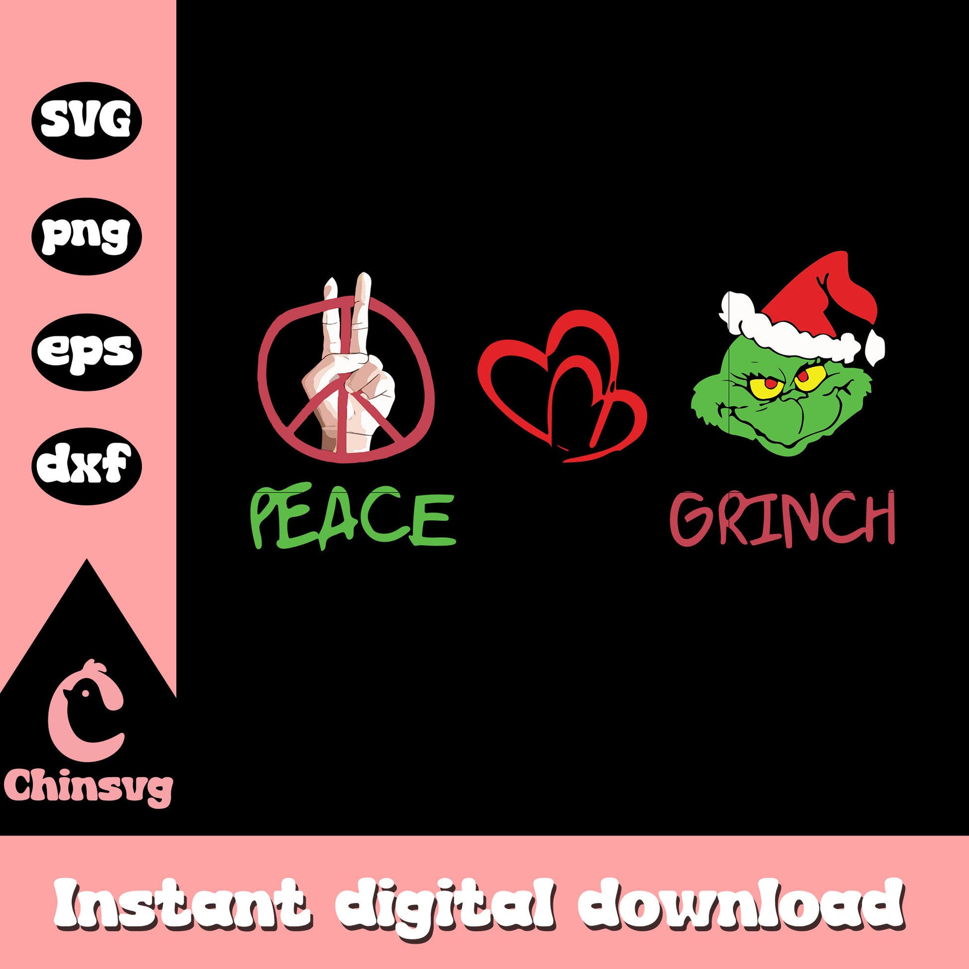 Peace love grinch face logo christmas svg is a product of our christmas collection. Perfect for DIY enthusiasts, crafters, and designers, this collection offers a wide range of festive elements like Christmas trees, Santa Claus, snowflakes, ornaments, reindeer, and more. Whether you’re designing greeting cards, personalized gifts, or home decor, these high-quality designs will help you create something truly special this Christmas.