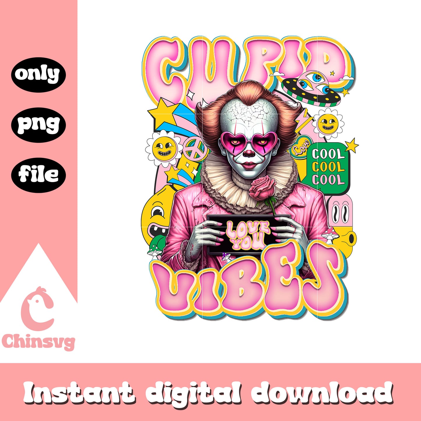 Pennywise cupid vibes love you png is a product of our Valentine collection. Whether you’re crafting personalized gifts, romantic cards, or decorating for a special day, this collection is filled with beautiful designs that capture the spirit of Valentine’s Day. Featuring hearts, roses, Cupid, love quotes, and more, these high-quality files will inspire your creativity and help you make something truly unforgettable for your loved ones.